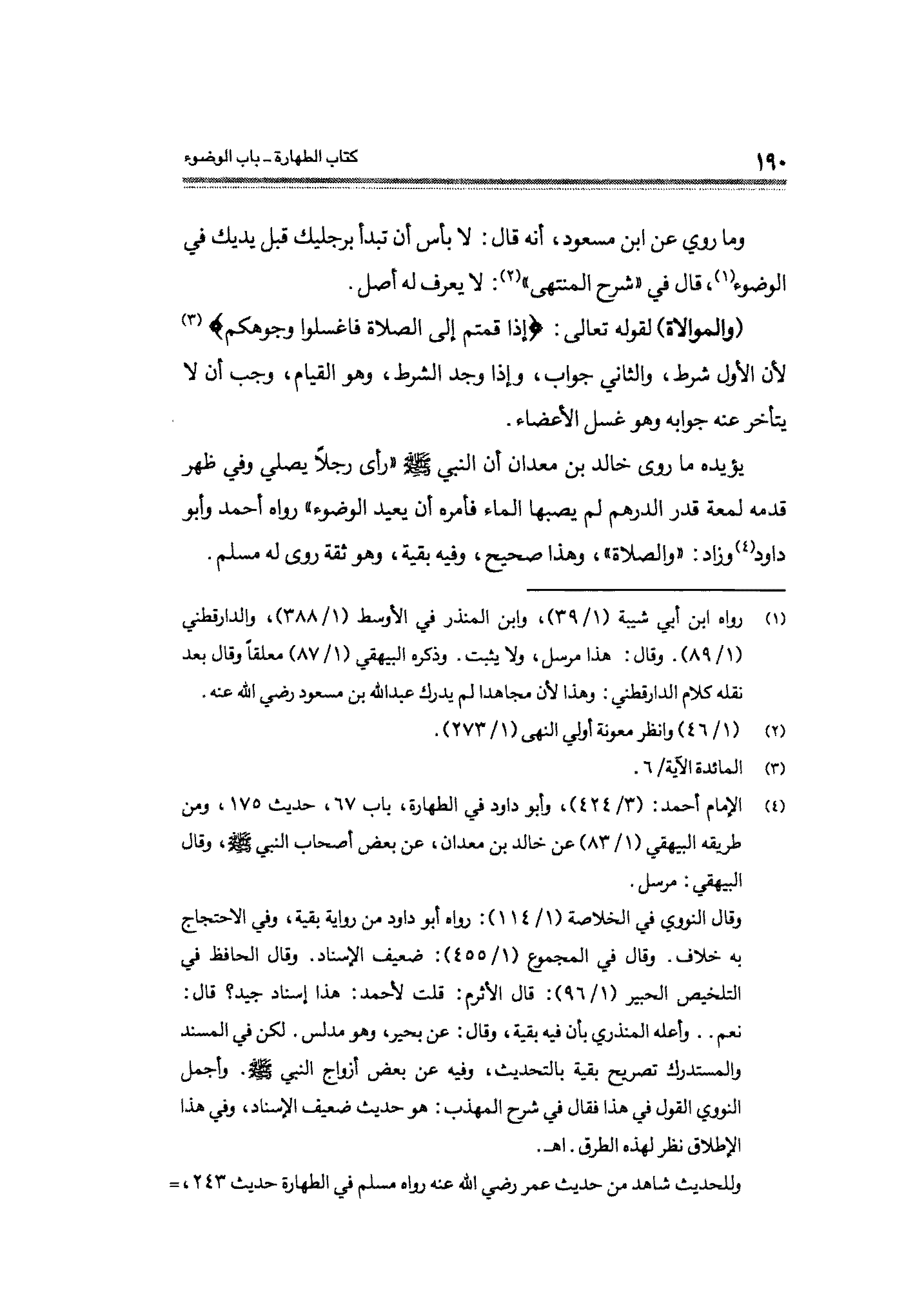يؤيده ما روى خالد بن معدان أن النبي - صلى الله عليه وسلم - "رأى رجلًا يصلِّي وفي ظهر قدمه لمعة قدر الدرهم لم يصبها الماء فأمره أن يعيد الوضوء" رواه أحمد وأبو داود (¬٤) وزاد: "والصلاة"، وهذا صحيح، وفيه بقية، وهو ثقة روي له مسلم.