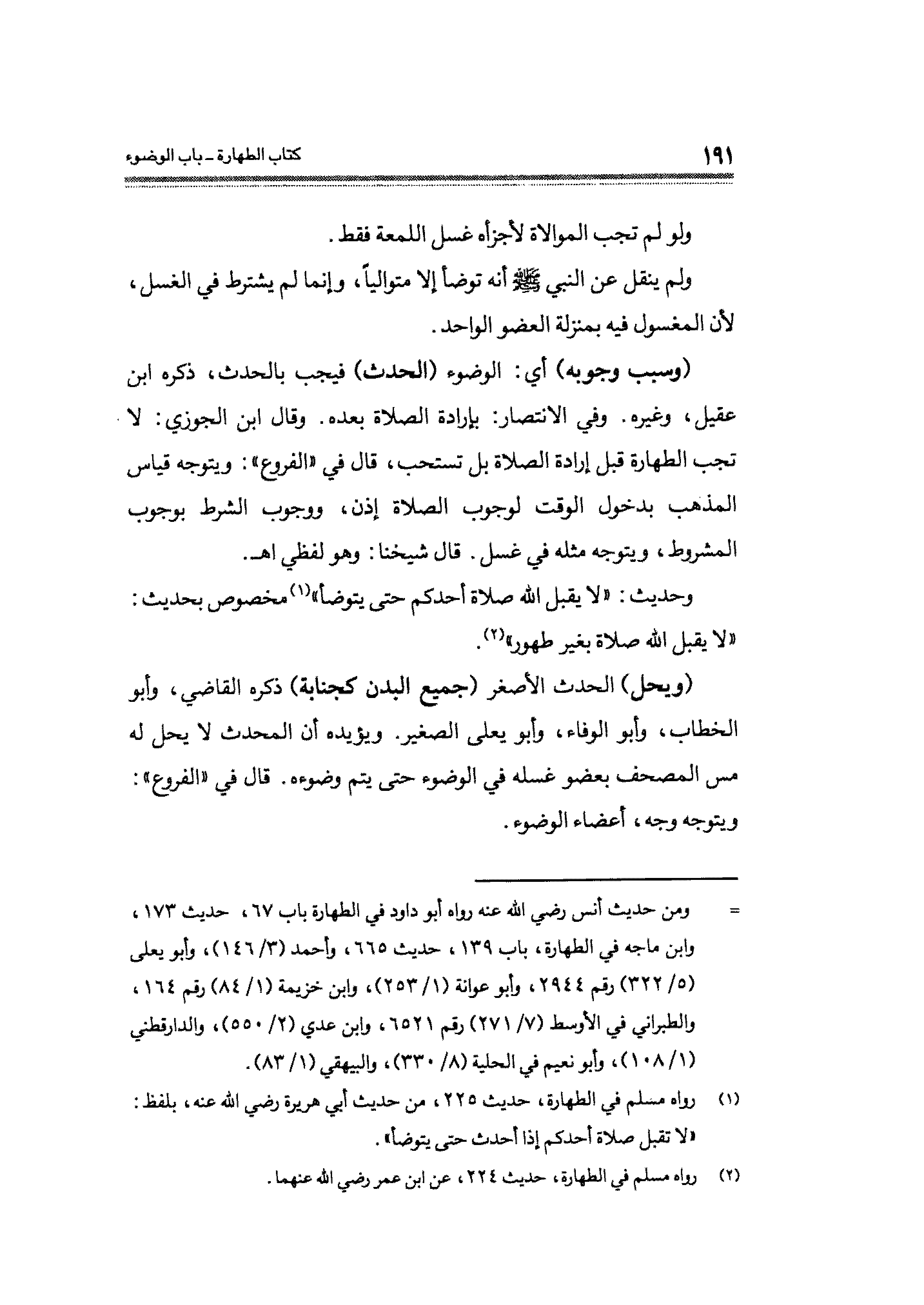 (وسبب وجوبه) أي: الوضوء (الحدث) فيجب بالحدث، ذكره ابن عقيل، وغيره. وفي الانتصار: بإرادة الصَّلاة بعده. وقال ابن الجوزي: لا تجب الطهارة قبل إرادة الصَّلاة بل تستحب، قال في "الفروع": ويتوجه قياس المذهب. بدخول الوقت لوجرب الصَّلاة إذن، ووجوب الشرط بوجوب المشروط، ويتوجه مثله في غسل. قال شيخنا: وهو لفظي ا هـ.