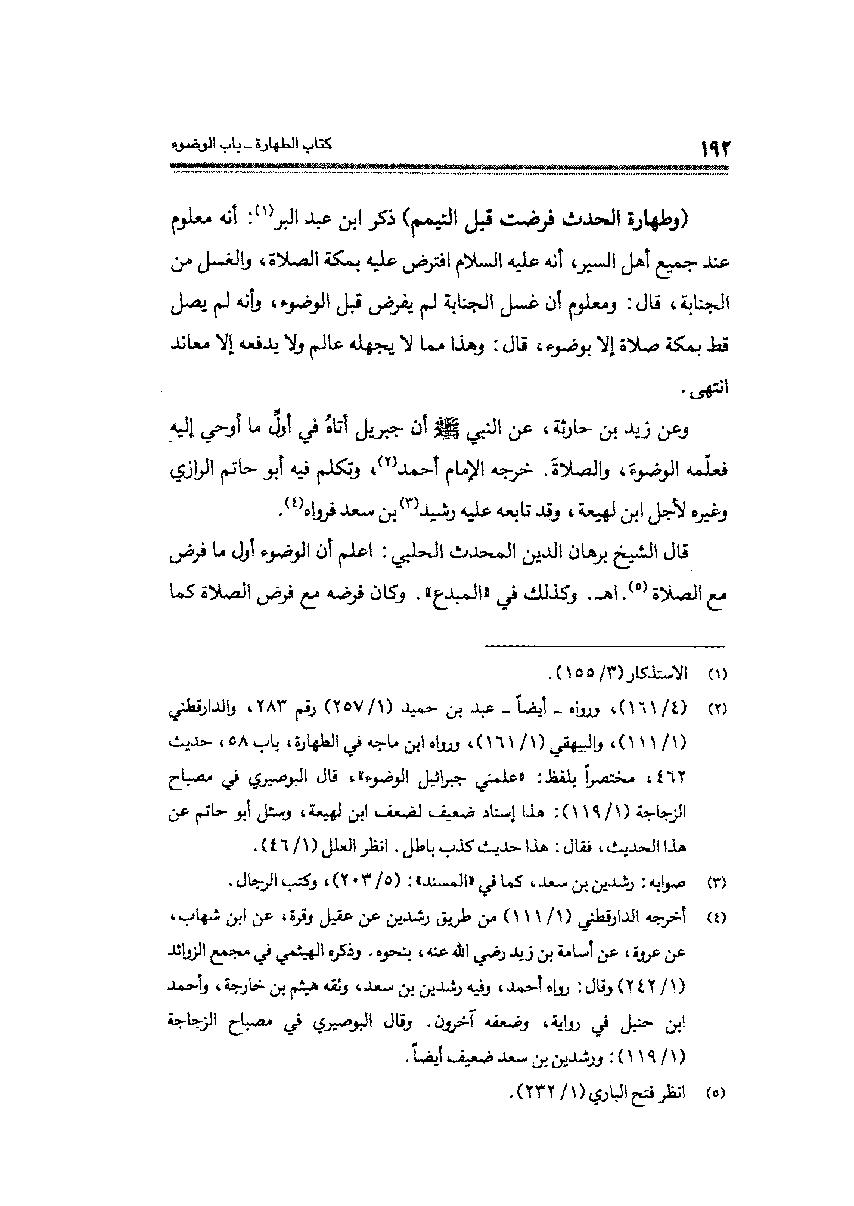 وعن زيد بن حارثة، عن النبي - صلى الله عليه وسلم - أن جبريل أتاهُ في أول ما أوحي إليه فعلمه الوضوءَ، والصلاةَ. خرجه الإمام أحمد (¬٢)، وتكلم فيه أبو حاتم الرازي وغيره لأجل ابن لهيعة، وقد تابعه عليه رشيد (¬٣) بن سعد فرواه (¬٤).