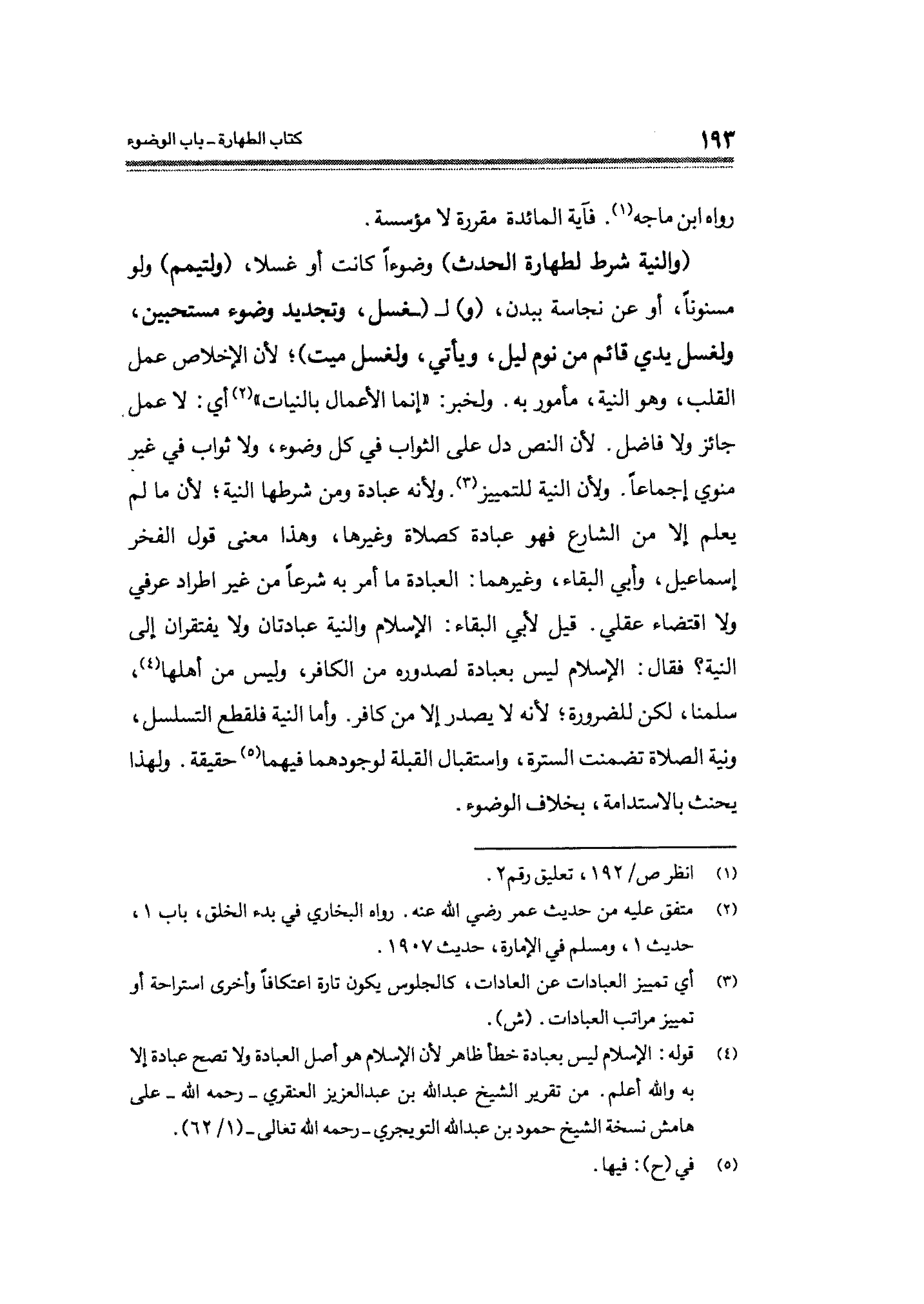 (والنية شرط لطهارة الحدث) وضوءًا كانت أو غسلًا، (ولتيمم) ولو مسنونًا، أو عن نجاسة ببدن، (و) لـ (ـغسل، وتجديد وضوء مستحبين، ولغسل يدي قائم من نوم ليل، ويأتي، ولغسل ميت)؛ لأنَّ الإخلاص عمل القلب، فهو النيَّة، مأمور به. ولخبر: "إنَّما الأعمال بالنيات" (¬٢) أي: لا عمل جائز ولا فاضل. لأنَّ النص دل على الثواب في كل وضوء، ولا ثواب في غير منوي إجماعًا. ولأن النيَّة للتمييز (¬٣). ولأنَّه عبادة ومن شرطها النيَّة؛ لأنَّ ما لم يعلم إلَّا من الشارع فهو عبادة كصلاة وغيرها، وهذا معنى قول الفخر إسماعيل، وأبي البقاء، وغيرهما: العبادة ما أمر به شرعًا عن غير اطراد عرفي ولا اقتضاء عقلي. قيل لأبي البقاء: الإسلام والنية عبادتان ولا يفتقران إلى النيَّة؟ فقال: الإسلام ليس بعبادة لصدوره من الكافر، وليس من أهلها (¬٤)؛ سلمنا؛ لكن للضرورة؛ لأنَّه لا يصدر إلَّا عن كافر. وأمَّا النيَّة فلقطع التسلسل؛ ونية الصلاة تضمنت السترة، واستقبال القبلة لوجودهما فيهما (¬٥) حقيقة. ولهذا يحنث بالاستدامة، بخلاف الوضوء.