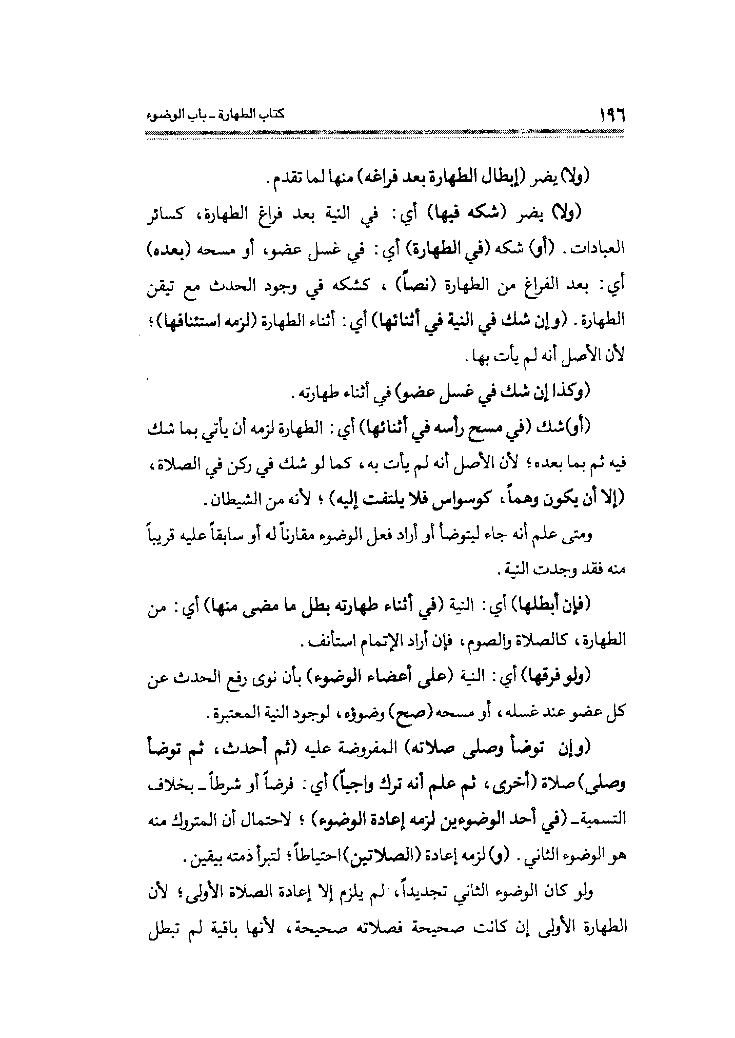 (ولا) يضر (شكه فيها) أي: في النية بعد فراغ الطهارة، كسائر العبادات. (أو) شكه (في الطهارة) أي: في غسل عضو، أو مسحه (بعده) أي: بعد الفراغ من الطهارة (نصًّا)، كشكه في وجود الحدث مع تيقن الطهارة. (وإن شك في النيَّة في أثنائها) أي: أثناء الطهارة (لزمه استئنافها)؛ لأنَّ الأصل أنه لم يأت بها.