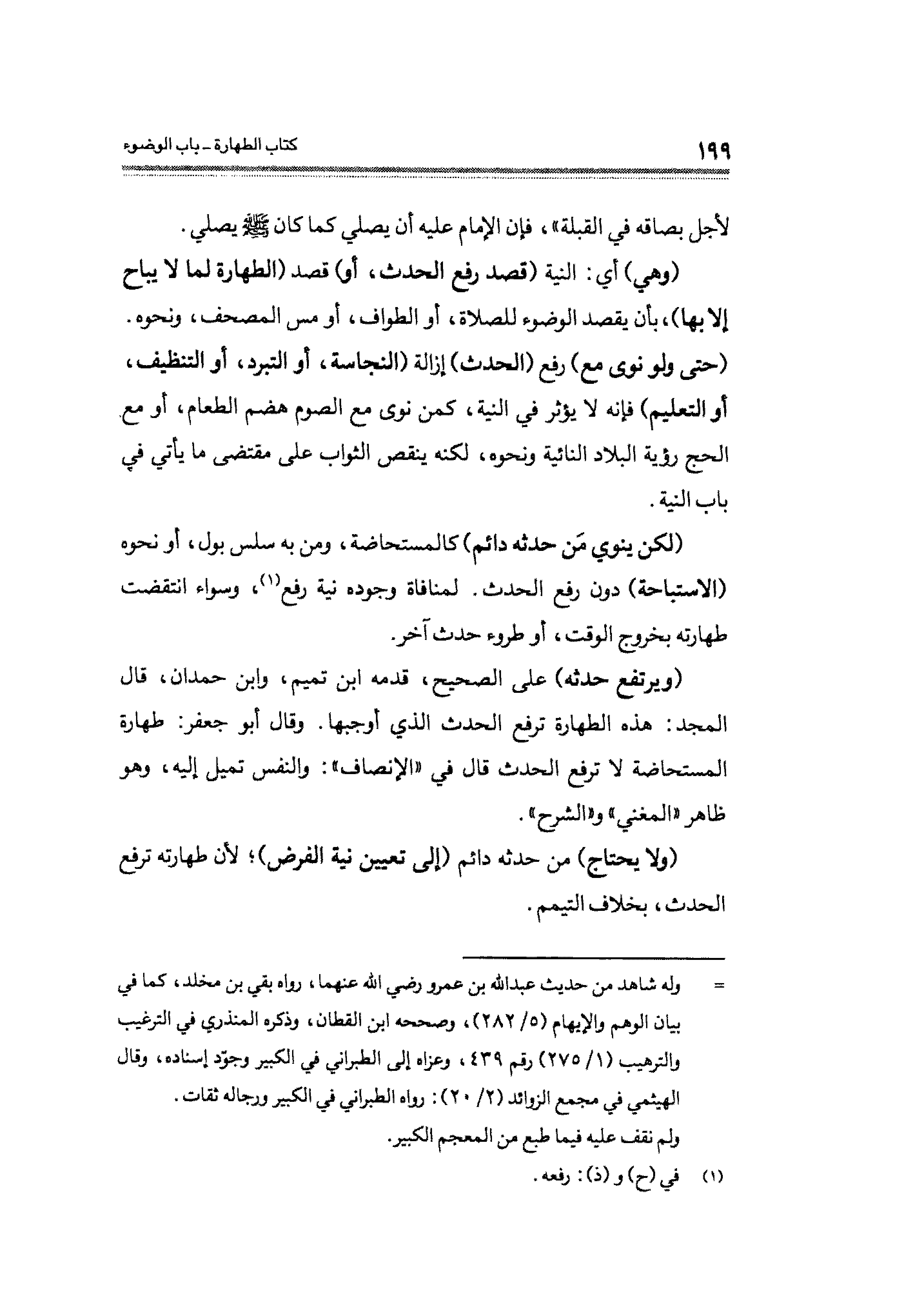 (وهي) أي: النية (قصد رفع الحديث، أو) قصد (الطهارة لما لا يباح إلا بها)، بأن يقصد الوضوء للصلاة، أو الطواف، أو مس المصحف، ونحوه. (حتى ولو نوى مع) رفع (الحدث) إزالة (النجاسة، أو التبرد، أو التنظيف، أو التعليم) فإنه لا يؤثر في النية، كمن نوى مع الصوم هضم الطعام، أو مع الحج رؤية البلاد النائية ونحوه، لكنه ينقص الثواب على مقتضى ما يأتي في باب النية.