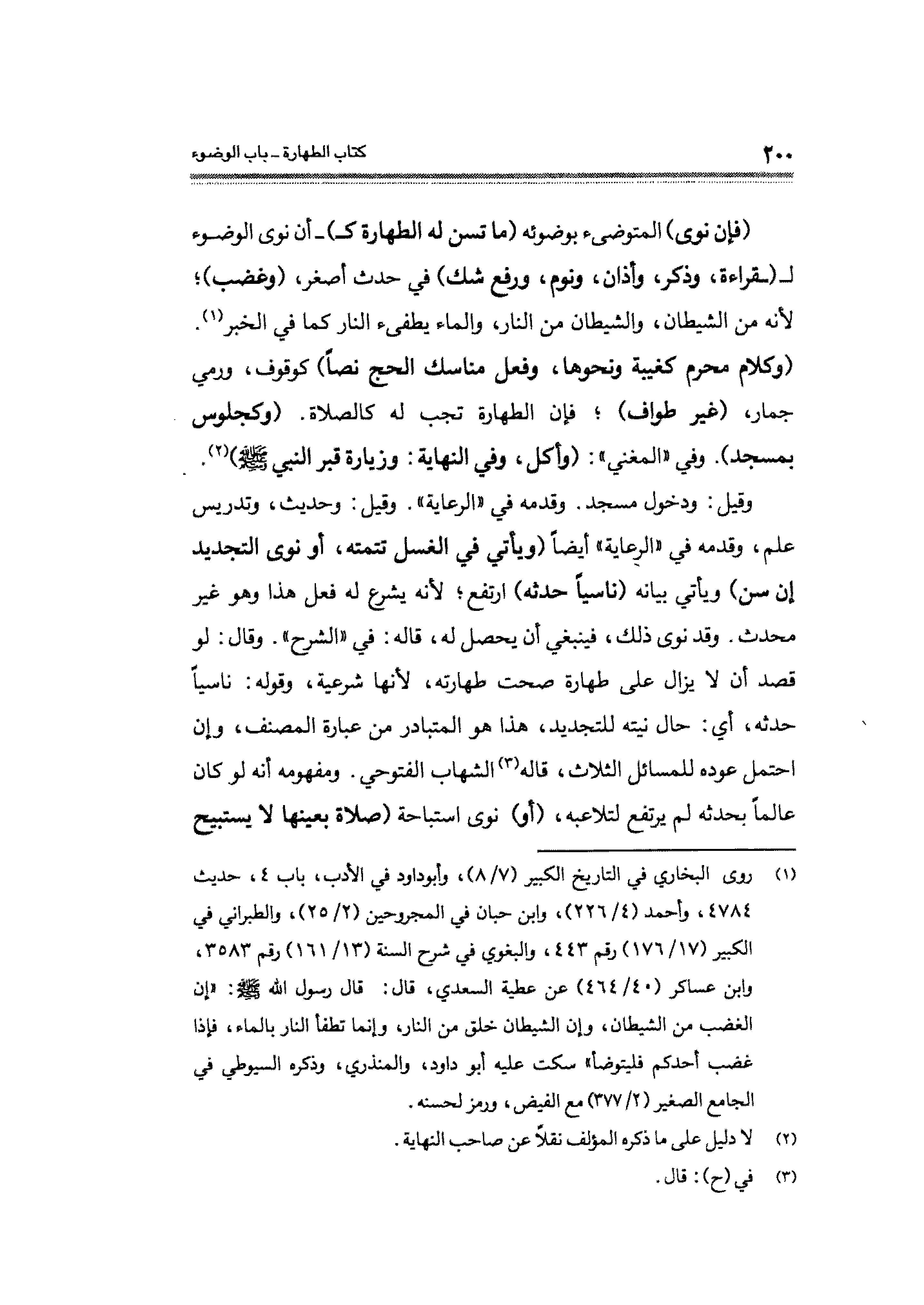 (فإن نوى) المتوضئ بوضوئه (ما تسن له الطهارة كـ) -إن نوى الوضوء لـ (ـقراءة، وذكر، وأذان، ونوم، ورفع شك) في حدث أصغر، (وغضب)؛ لأنه من الشيطان، والشيطان من النار، والماء يطفئ النار كما في الخبر (¬١). (وكلام محرم كغيبة ونحوها، وفعل مناسك الحج نصًّا) كوقوف، ورمى جمار، (غير طواف)؛ فإن الطهارة تجب له كالصلاة. (وكجلوس بمسجد). وفي "المغني": (وأكل، وفي النهاية: وزيارة قبر النبي - صلى الله عليه وسلم -) (¬٢).