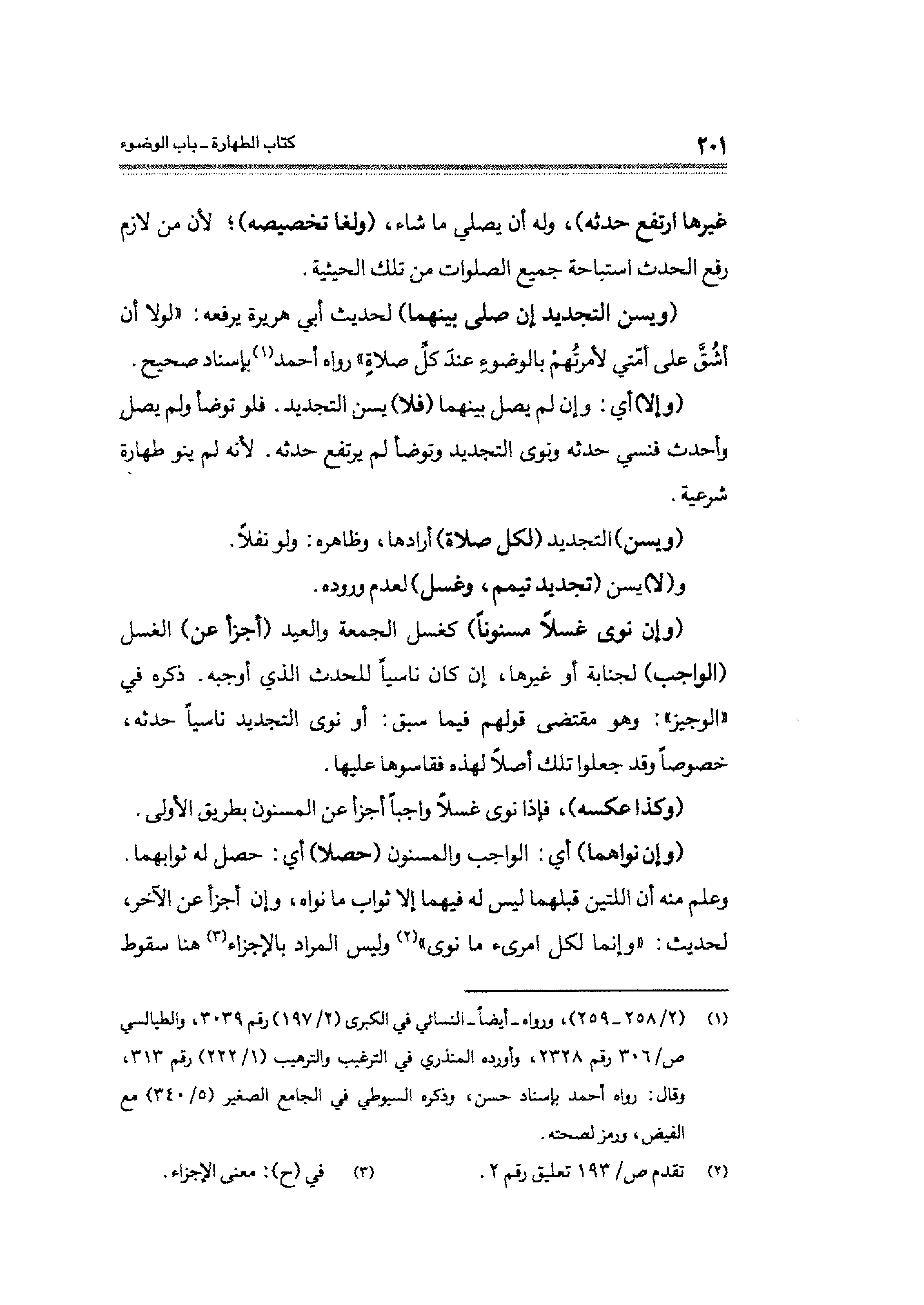 (¬١) (٢/ ٢٥٨ - ٢٥٩) ورواه -أيضًا- النسائي في الكبرى (٢/ ١٩٧) رقم ٣٠٣٩، والطيالسي ص / ٣٠٦ رقم ٢٣٢٨، وأورد المنذري في الترغيب والترهيب (١/ ٢٢٢) رقم ٣١٣، وقال: رواه أحمد بإسناد حسن، وذكره السيوطي في الجامع الصغير (٥/ ٣٤٠) مع الفيض، ورمز لصحته.