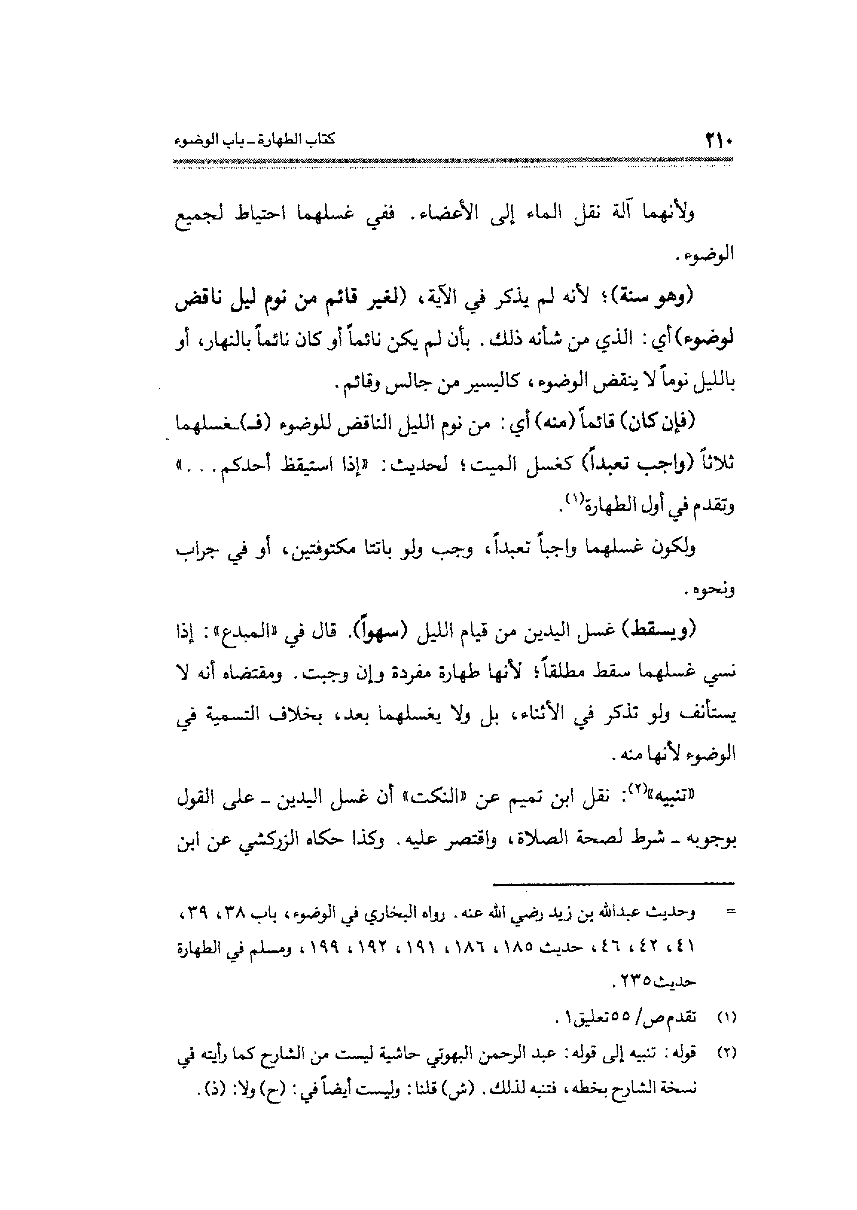 (وهو سنة)؛ لأنه لم يذكر في الآية، (لغير قائم من نوم ليل ناقض لوضوء) أي: الَّذي من شأنه ذلك. بأن لم يكن نائمًا أو كان نائمًا بالنهار، أو بالليل نومًا لا ينقض الوضوء، كاليسير من جالس وقائم.