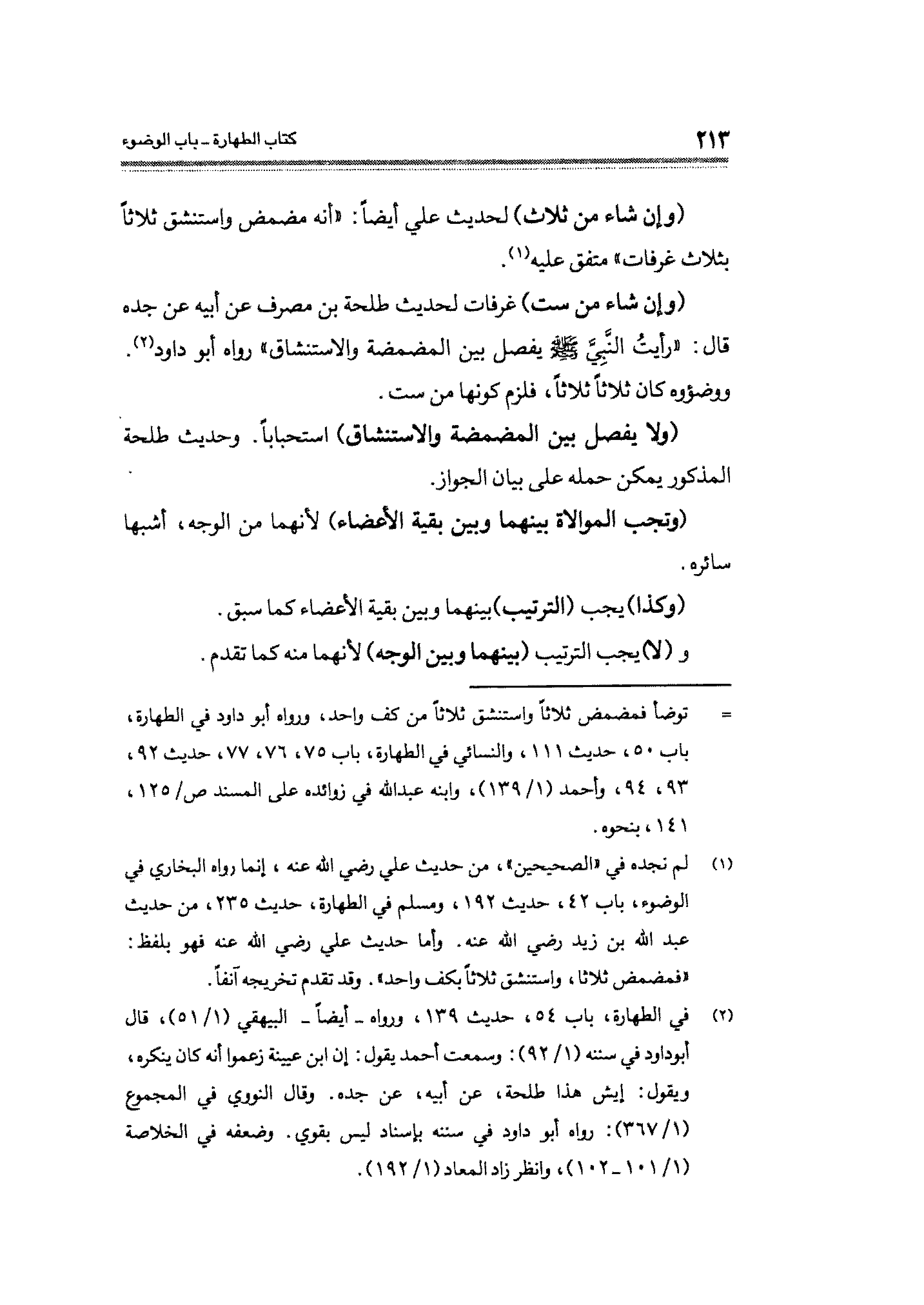 (ولا يفصل ببن المضمضة والاستنشاق) استحبابًا. وحديث طلحة المذكور يمكن حمله على بيان الجواز.