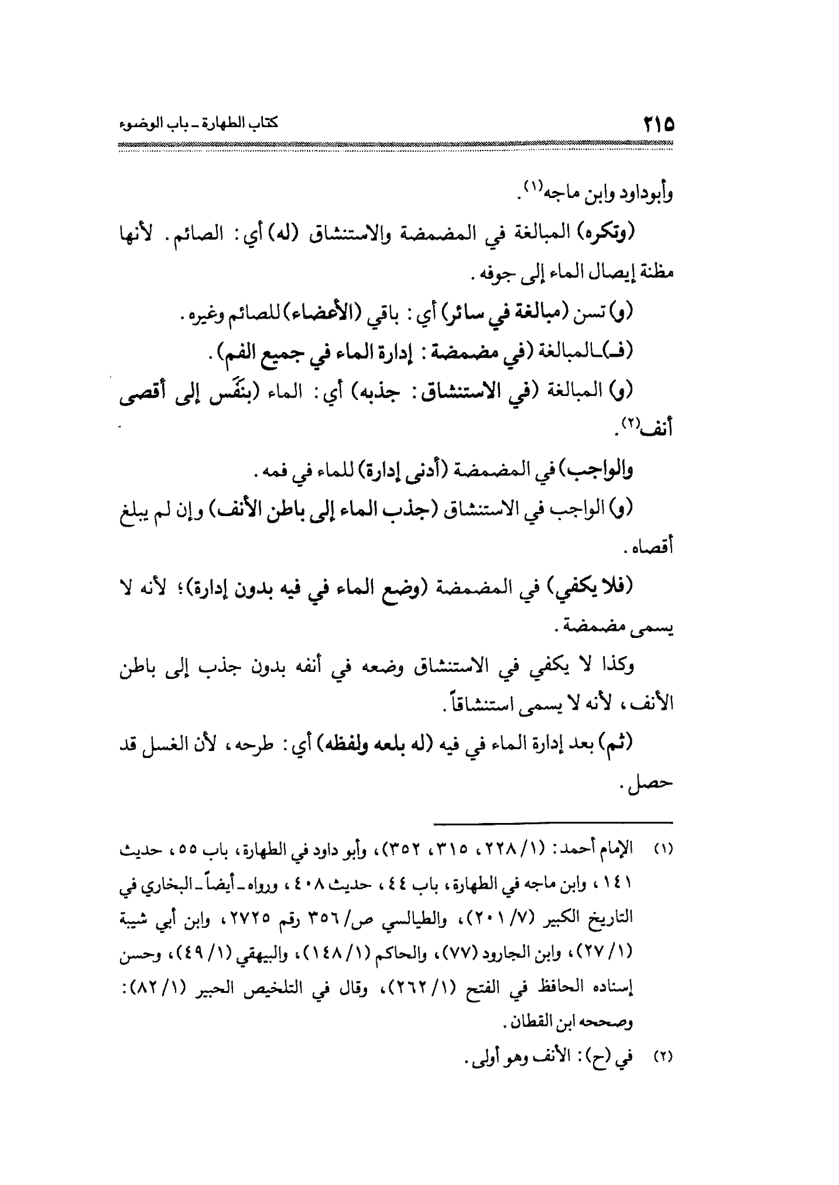 (¬١) الإمام أحمد: (١/ ٢٢٨، ٣١٥، ٣٥٢)، وأبو داود في الطهارة، باب ٥٥، حديث ١٤١، وابن ماجة في الطهارة، باب ٤٤، حديث ٤٠٨، ورواه -أيضًا- البخاري في التاريخ الكبير (١/ ٢٠٧)، والطيالسي ص / ٣٥٦ رقم ٢٧٢٥، وابن أبي شيبة: (١/ ٢٧)، وابن الجارود (٧٧)، والحاكم (١/ ١٤٨)، والبيهقي (١/ ٤٩)، وحسن إسناده الحافظ في الفتح (١/ ٢٦٢)، وقال في التلخيص الحبير (١/ ٨٢): وصححه ابن القطان.