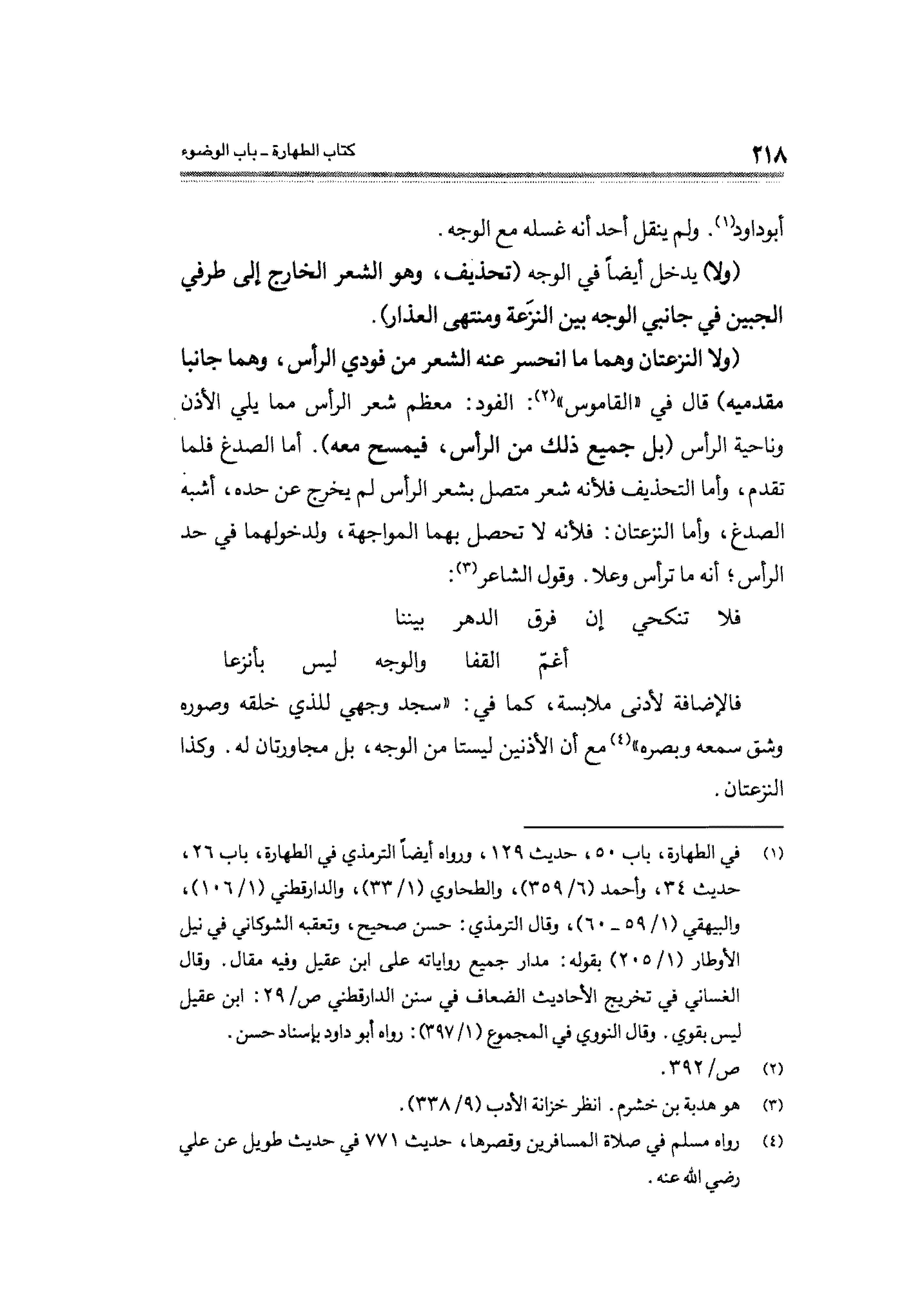 (ولا النزعتان وهما ما انحسر عنه الشعر من فودي الرأس، وهما جانبا مقدميه) قال في "القاموس" (¬٢): الفود: معظم شعر الرأس مما يلي الأذن وناحية الرأس (بل جميع ذلك من الرأس، فيمسح معه). أما الصدغ فلما تقدم، وأما التحذيف فلأنه شعر متصل بشعر الرأس لم يخرج عن حده، أشبه الصدغ، وأما النزعتان: فلأنه لا تحصل بهما المواجهة، ولدخولهما في حد الرأس، أنه ما ترأس وعلا، وقول الشاعر (¬٣):