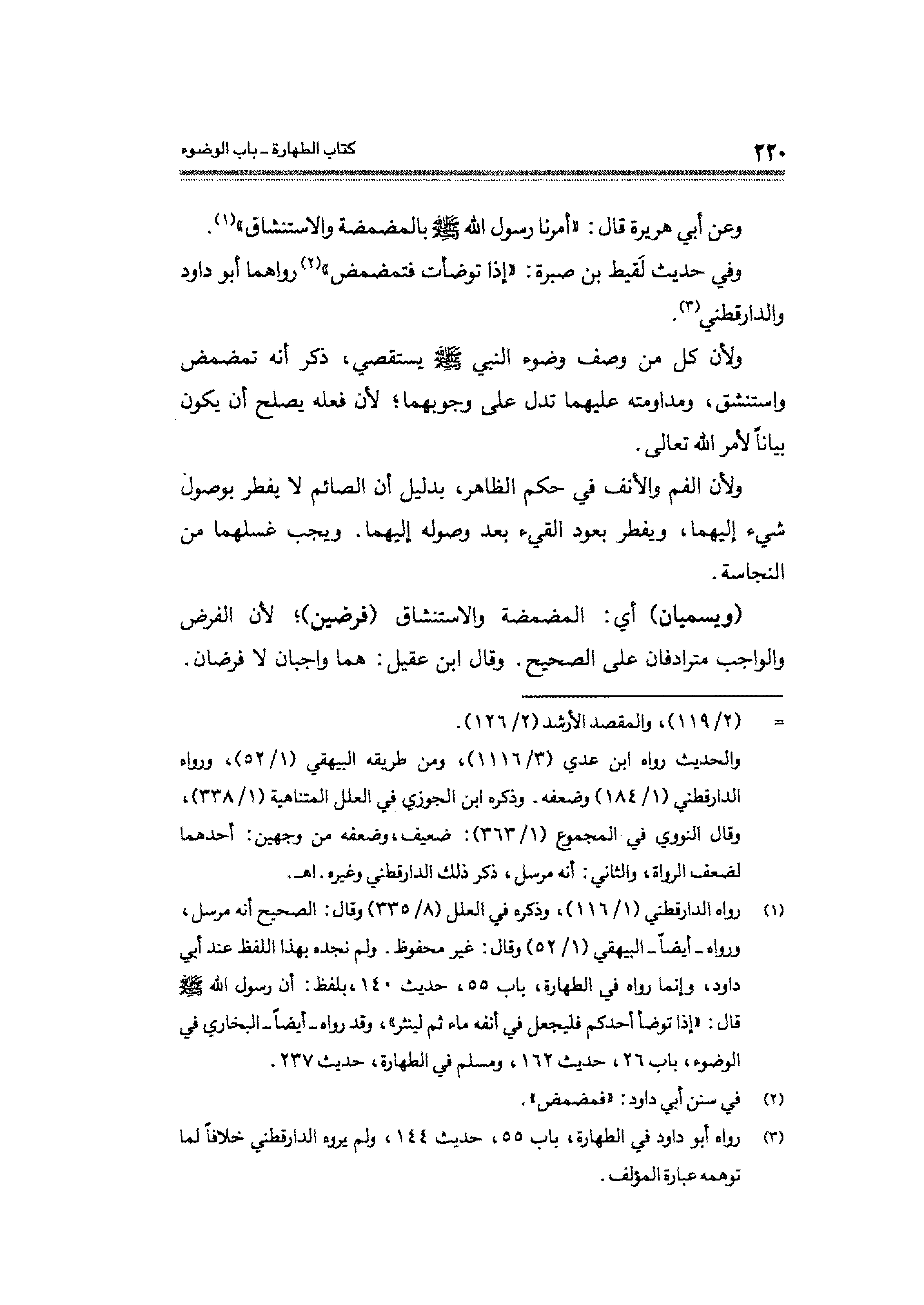 (¬١) رواه الدارقطني (١/ ١١٦)، وذكر في العلل (٨/ ٣٣٥) وقال: الصحيح أنه مرسل، ورواه -أيضًا- البيهقي (١/ ٥٢) وقال: غير محفوظ. ولم نجده بهذا اللفظ عند أبي داود، وإنما رواه في الطهارة، باب ٥٥، حديث ١٤٠، بلفظ: أن رسول الله - صلى الله عليه وسلم - قال: "إذا توضأ أحدكم فليجعل في أنفه ماء ثم لينتثر"، وقد رواه -أيضًا- البخاري في الوضوء، باب ٢٦، حديث ١٦٢، ومسلم في الطهارة، حديث ٢٣٧.