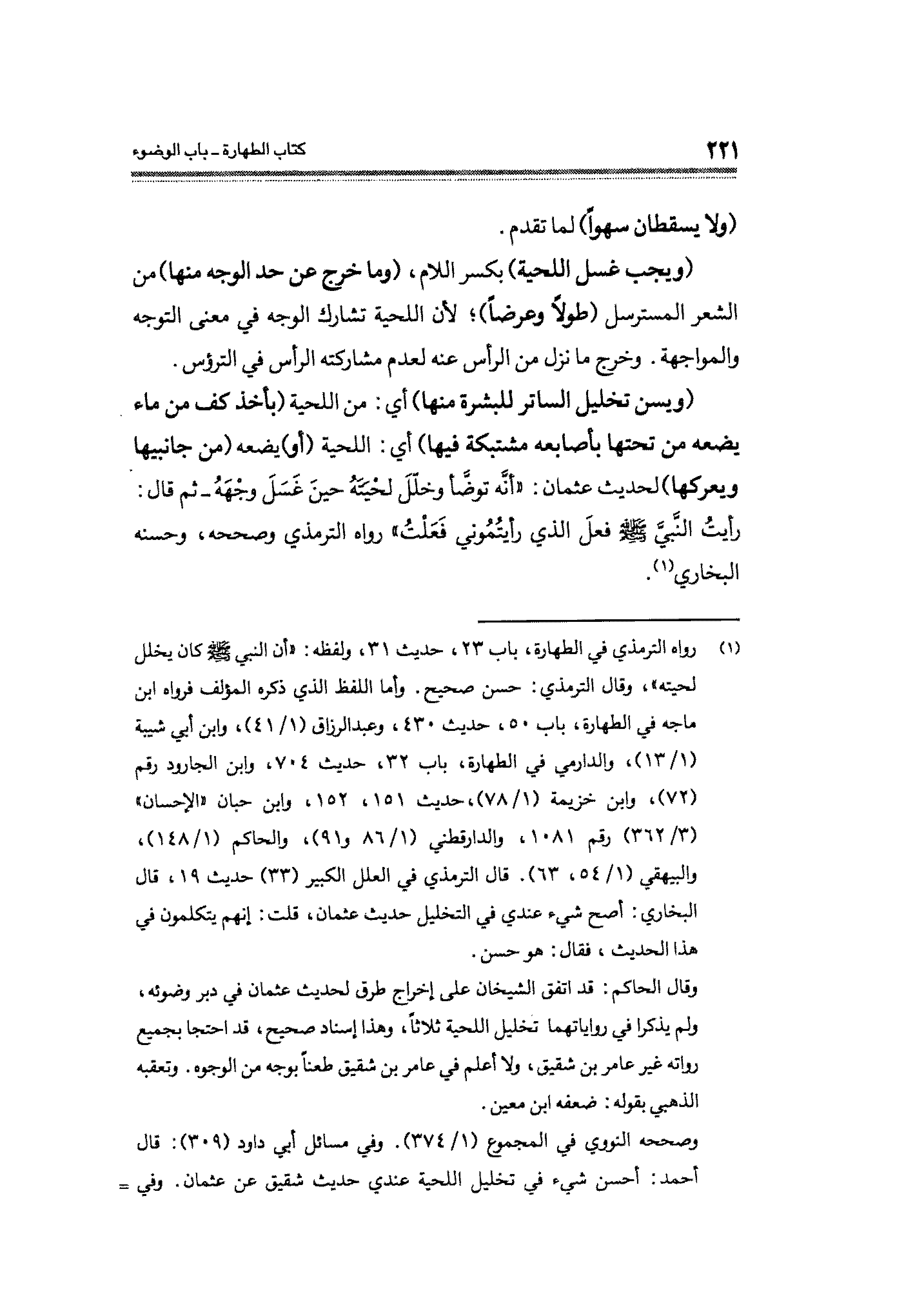 وقال الحاكم: قد اتفق الشيخان على إخراج طرق لحديث عثمان دبر وضوئه، ولم يذكرا في رواياتهما تخيليل اللحية ثلاثًا، وهذا إسناد صحيح، قد احتجا بجميع رواته غير عامر بن شقيق، ولا أعلم في عامر بن شقيق طعنًا بوجه من الوجوه. وتعقبه الذهبي بقوله. ضعفه ابن معين.