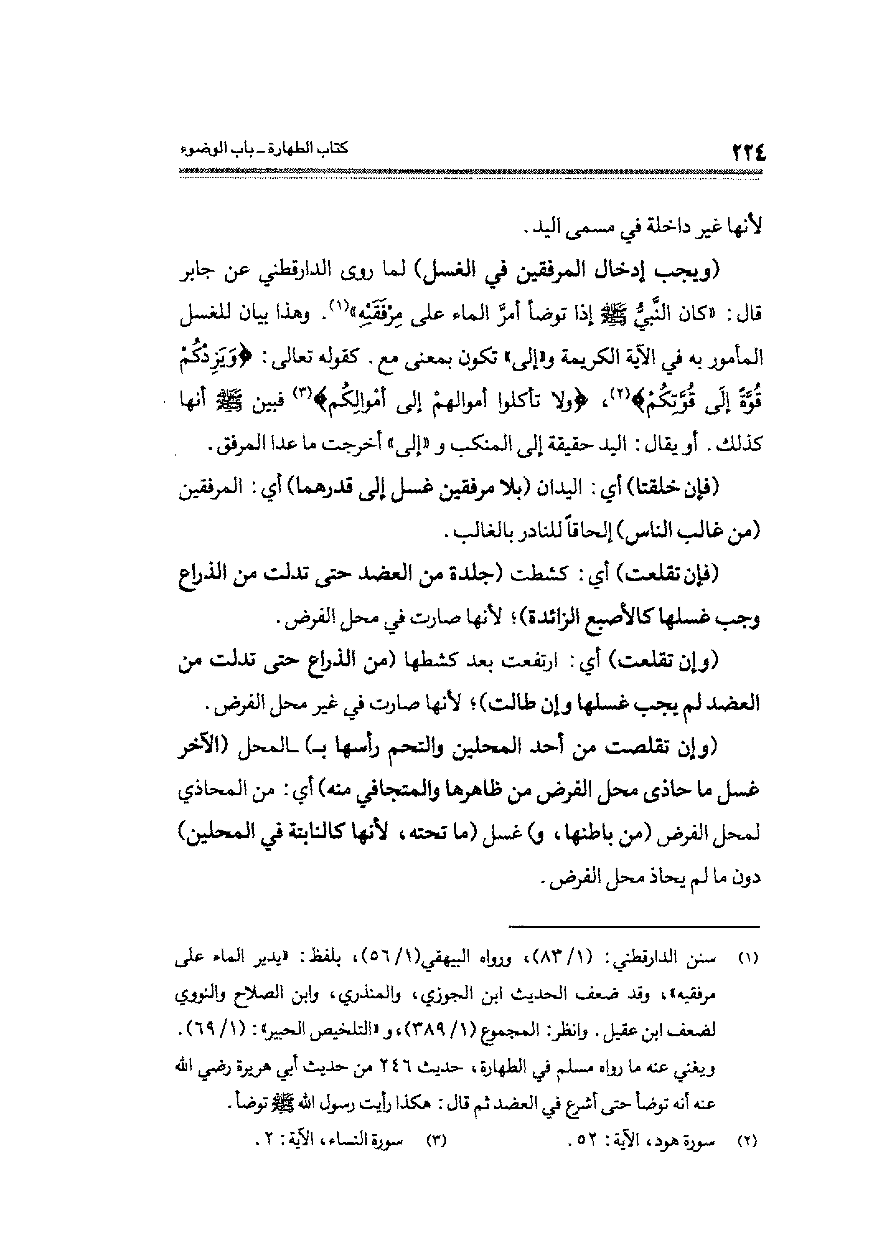 (ويجب إدخال المرفقين في الغسل) لما روى الدارقطني عن جابر قال: "كان النَّبيُّ - صلى الله عليه وسلم - إذا توضأ أمرَّ الماء على مِرْفَقَيهِ" (¬١). وهذا بيان للغسل المأمور به في الآية الكريمة و"إلى" تكون بمعنى مع. كقوله تعالى: {وَيَزِدْكُمْ قُوَّةً إِلَى قُوَّتِكُمْ} (¬٢)، {وَلَا تَأْكُلُوا أَمْوَالَهُمْ إِلَى أَمْوَالِكُمْ} (¬٣) فبين - صلى الله عليه وسلم - أنها كذلك. أو يقال: اليد حقيقة إلى المنكب و"إلى" أخرجت ما عدا المرفق.