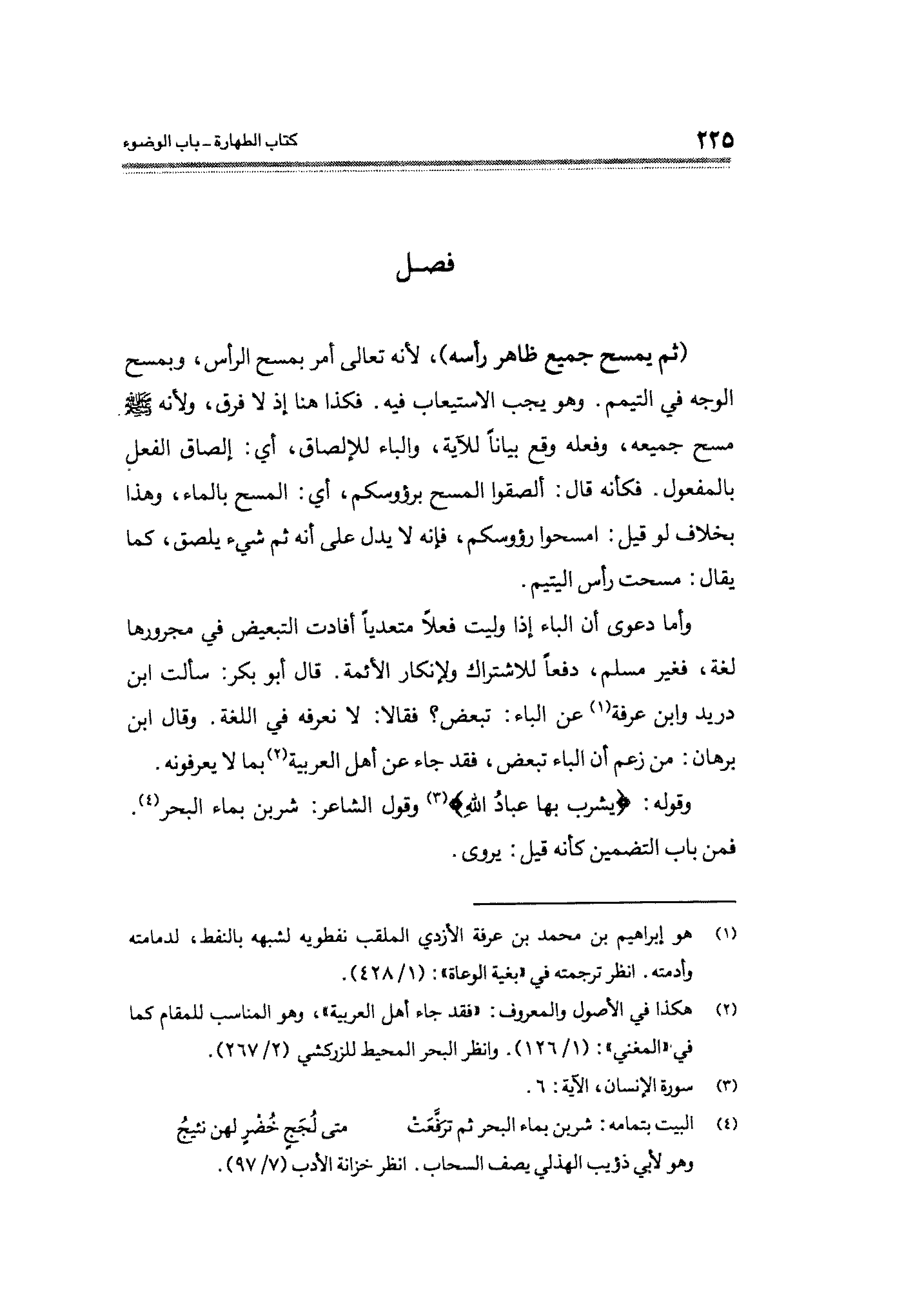 وأما دعوى أن الباء إذا وليت فعلًا متعديًا أفادت التبعيض في مجرورها لغة، فغير مسلم، دفعًا للاشتراك ولإنكار الأئمة. قال أبو بكر: سألت ابن دريد وابن عرفة (¬١) عن الباء: تبعض؟ فقالا: لا نعرفه في اللغة. وقال ابن برهان: من زعم أن الباء تبعض، فقد جاء عن أهل العربية (¬٢) بما لا يعرفونه.