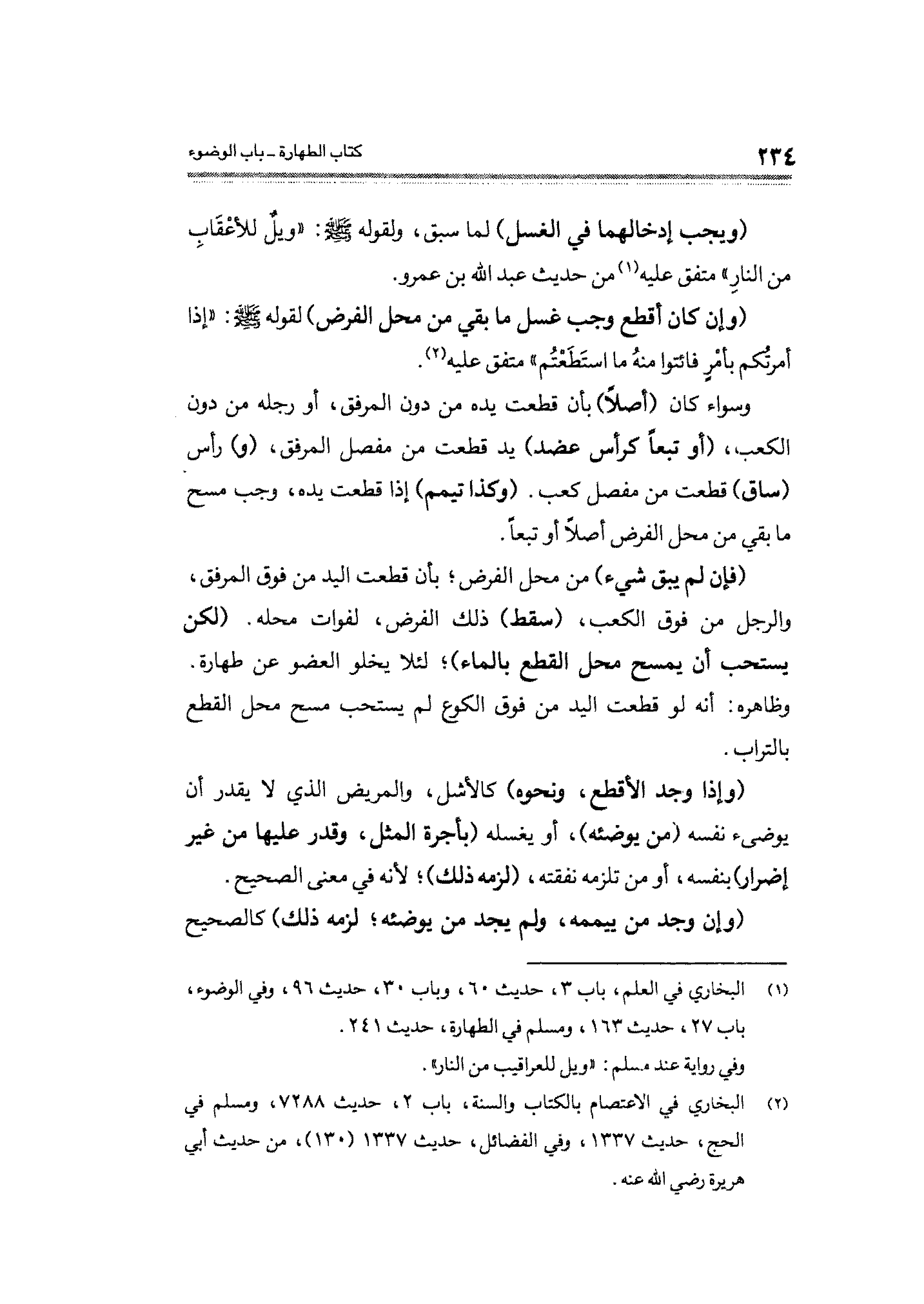 (ويجب إدخالهما في الغسل) لما سبق، ولقوله - صلى الله عليه وسلم -: "ويلٌ للأعقَابِ من النارِ" متفق عليه (¬١) من حديث عبد الله بن عمرو.