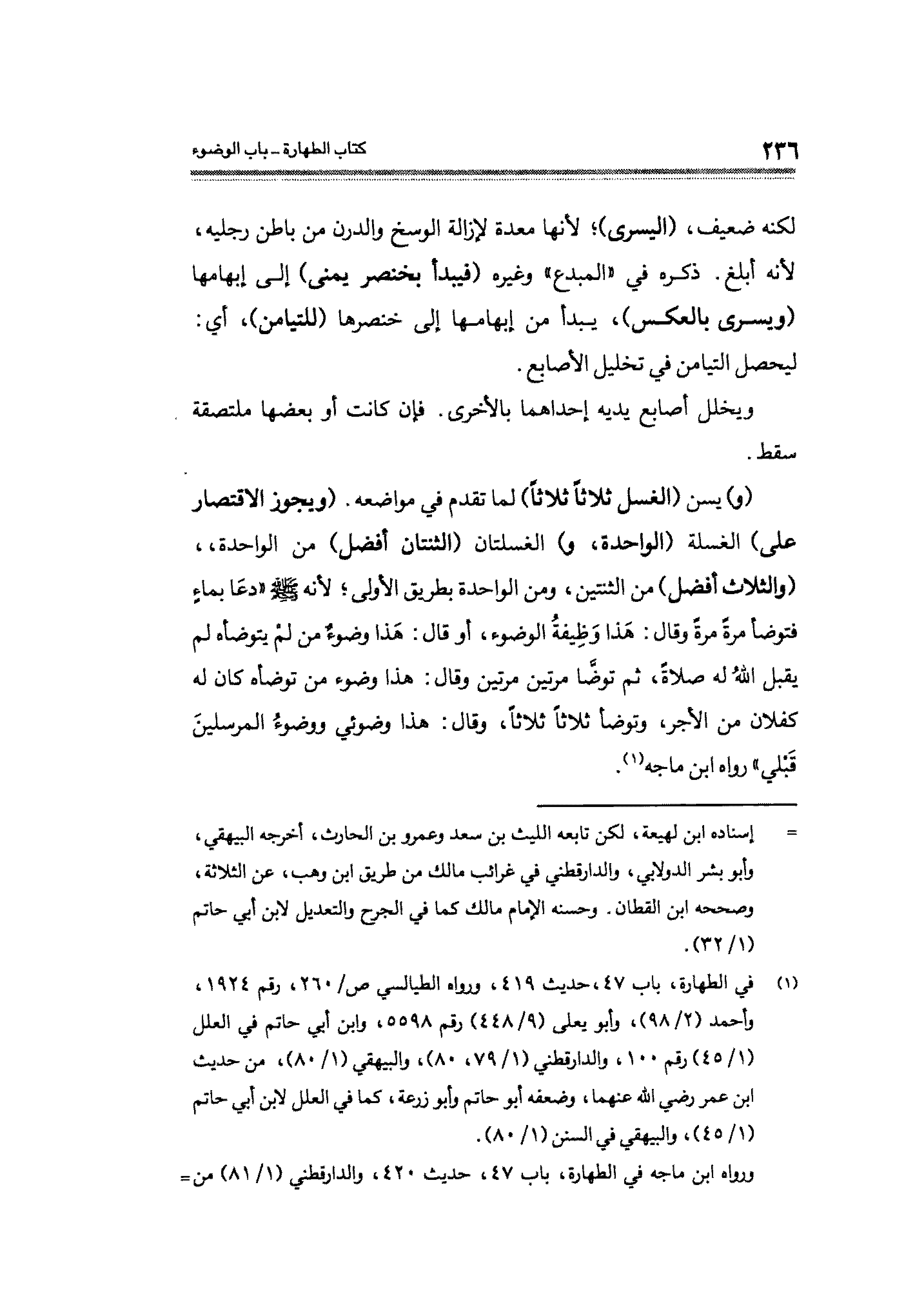 (¬١) في الطهارة، باب ٤٧، حديث ٤١٩، ورواه الطيالسي ص / ٢٦٠، رقم ١٩٢٤، وأحمد (٢/ ٩٨)، وأبو يعلى (٩/ ٤٤٨) رقم ٥٥٩٨، وابن أبي حاتم في العلل (١/ ٤٥) رقم ١٠٠، والدارقطني (١/ ٧٩، ٨٠)، والبيهقي (١/ ٨٠)، من حديث ابن عمر رضي الله عنهما، وضعفه أبو حاتم وأبو زرعة، كما في العلل لابن أبي حاتم (١/ ٤٥) والبيهقي في السنن (١/ ٨٠).