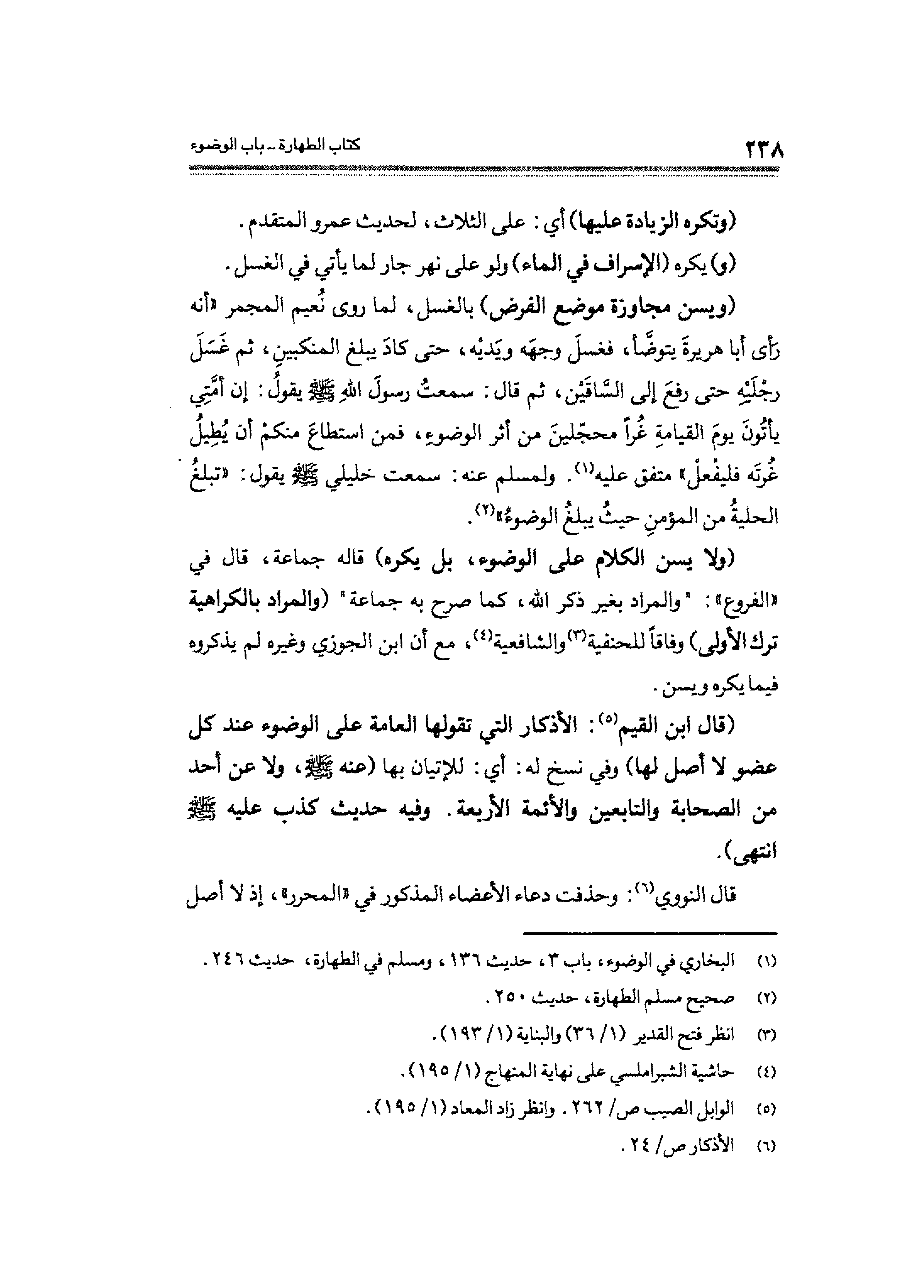 (و) يكره (الإسراف في الماء) ولو على نهر جار لما يأتي في الغسل. (ويسن مجاوزة موضع الفرض) بالغسل، لما روى نُعيم المجمر "أنه رَأى أبا هريرةَ يتوضَّأ، فغسلَ وجهَه ويَديْه، حتى كادَ بيلغ المنكبينِ، ثم غَسَلَ رجْلَيْهِ حتى رفعَ إلى السَّاقَيْن، ثم قال: سمعتُ رسولَ اللهِ - صلى الله عليه وسلم - يقولُ: إن أمَّتِي يأتُونَ يومَ القيامةِ غُرًا محجّلينَ من أثر الوضوءِ، فمن استطاعَ منكمْ أن يُطِيلُ غُرتَه فليفْعلْ" متفق عليه (¬١). ولمسلم عنه: سمعت خليلي - صلى الله عليه وسلم - يقول: "تبلغُ الحليةُ من المؤمنِ حيثُ يبلغُ الوضوءُ" (¬٢).