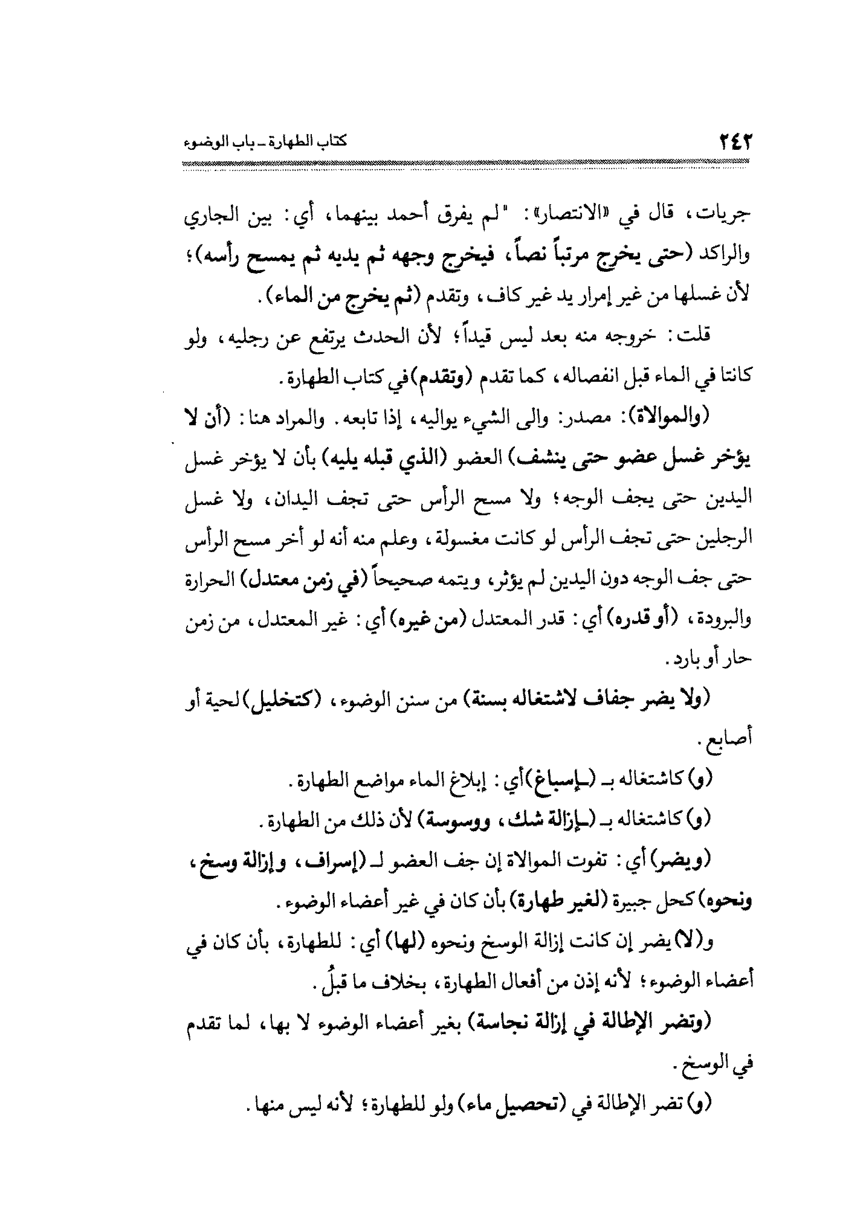 (والموالاة): مصدر: والى الشيء يواليه، إذا تابعه. والمراد هنا: (أن لا يؤخر غسل عضو حتى ينشف) العضو (الذي قبله يليه) بأن لا يؤخر غسل اليدين حتى يجف الوجه؛ ولا مسح الرأس حتى تجف اليدان، ولا غسل الرجلين حتى تجف الرأس لو كانت مغسولة، وعلم منه أنه لو أخر مسح الرأس حتى جف الوجه دون اليدين لم يؤثر، ويتمه صحيحًا (في زمن معتدل) الحرارة والبرودة، (أو قدره) أي: قدر المعتدل (من غيره) أي: غير المعتدل، من زمن حار أو بارد.