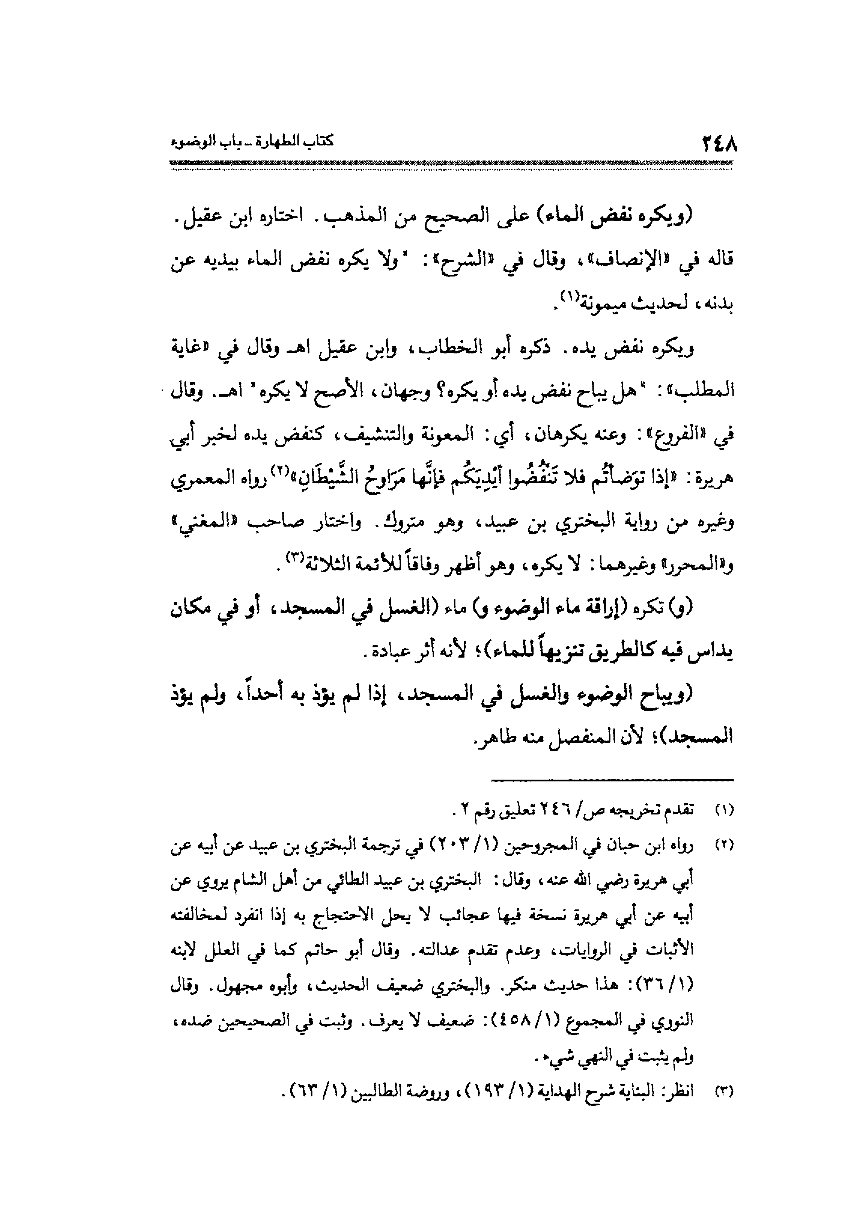 ويكره نفض يده. ذكره أبو الخطاب، وابن عقيل اهـ وقال في "غاية المطلب": "هل يباح نفض يده أو يكره؟ وجهان، الأصح لا يكره" اهـ. وقال في "الفروع": وعنه يكرهان، أي: المعونة والتنشيف، كنفض يده لخبر أبي هريرة: "إذا توَضأتُم فلا تَنْفُضُوا أيْدِيَكُم فإنَّها مَرَاوحُ الشَّيْطَانِ" (¬٢) رواه المعمري وغيره من رواية البختري بن عبيد، وهو متروك. واختار صاحب "المغني" و"المحور" وغيرهما: لا يكره، وهو أظهر وفاقًا للأئمة الثلاثة (¬٣).