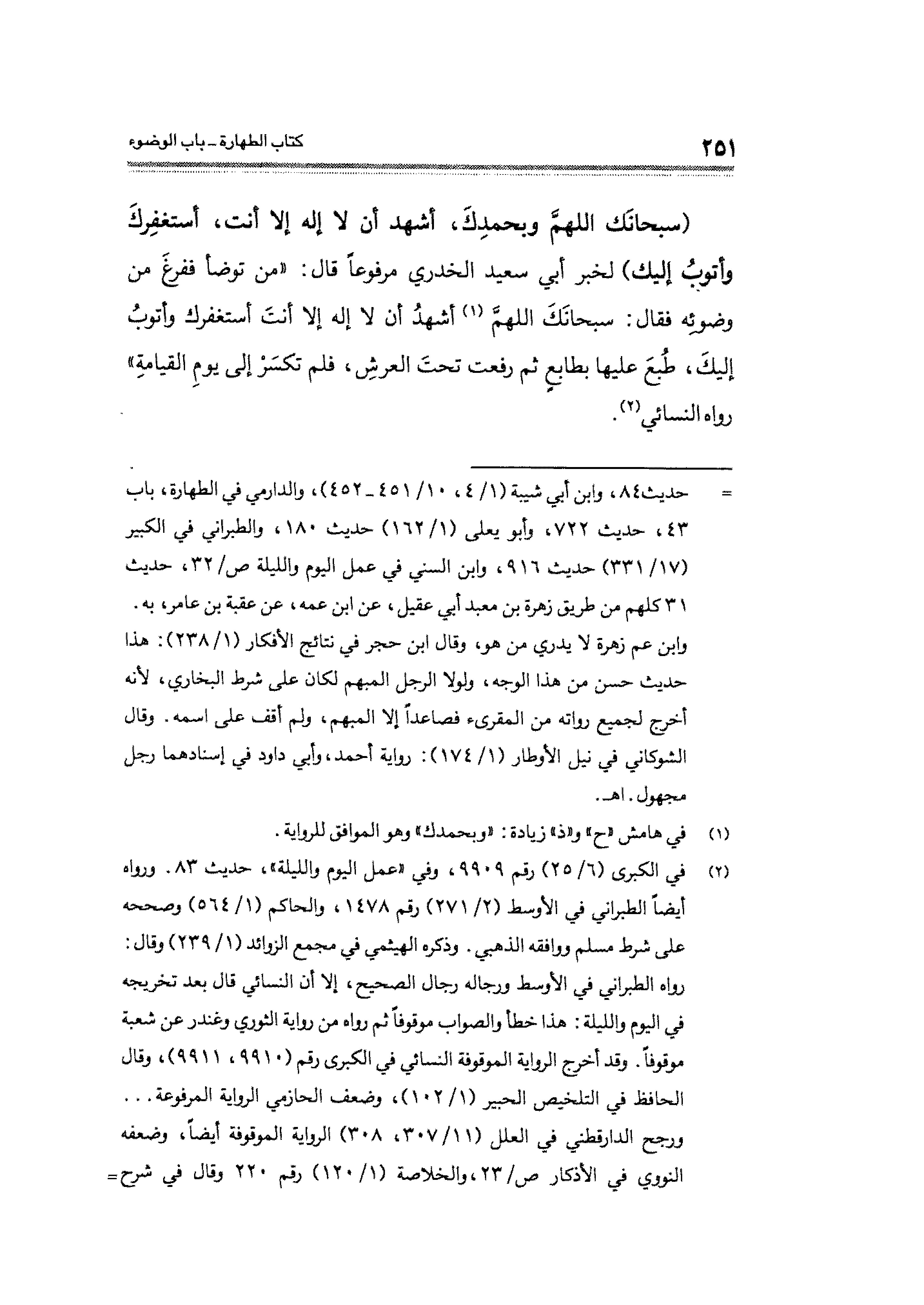 (سبحانَك اللهمَّ وبحمدِك، أشهد أن لا إله الا أنت، أستغفِركَ وأتوبُ إليك) لخبر أبي سعيد الخدري مرفوعًا قال: "من توضأ ففرغَ من وضوئِه فقال: سبحانَكَ اللهمَّ (¬١) أشهدُ أن لا إله إلا أنتَ أستغفرك وأتوبُ إليكَ، طُبعَ عليها بطابعٍ ثم رفعت تحتَ العرشِ، فلم تكسَرْ إلى يومِ القيامةِ" رواه النسائي (¬٢).