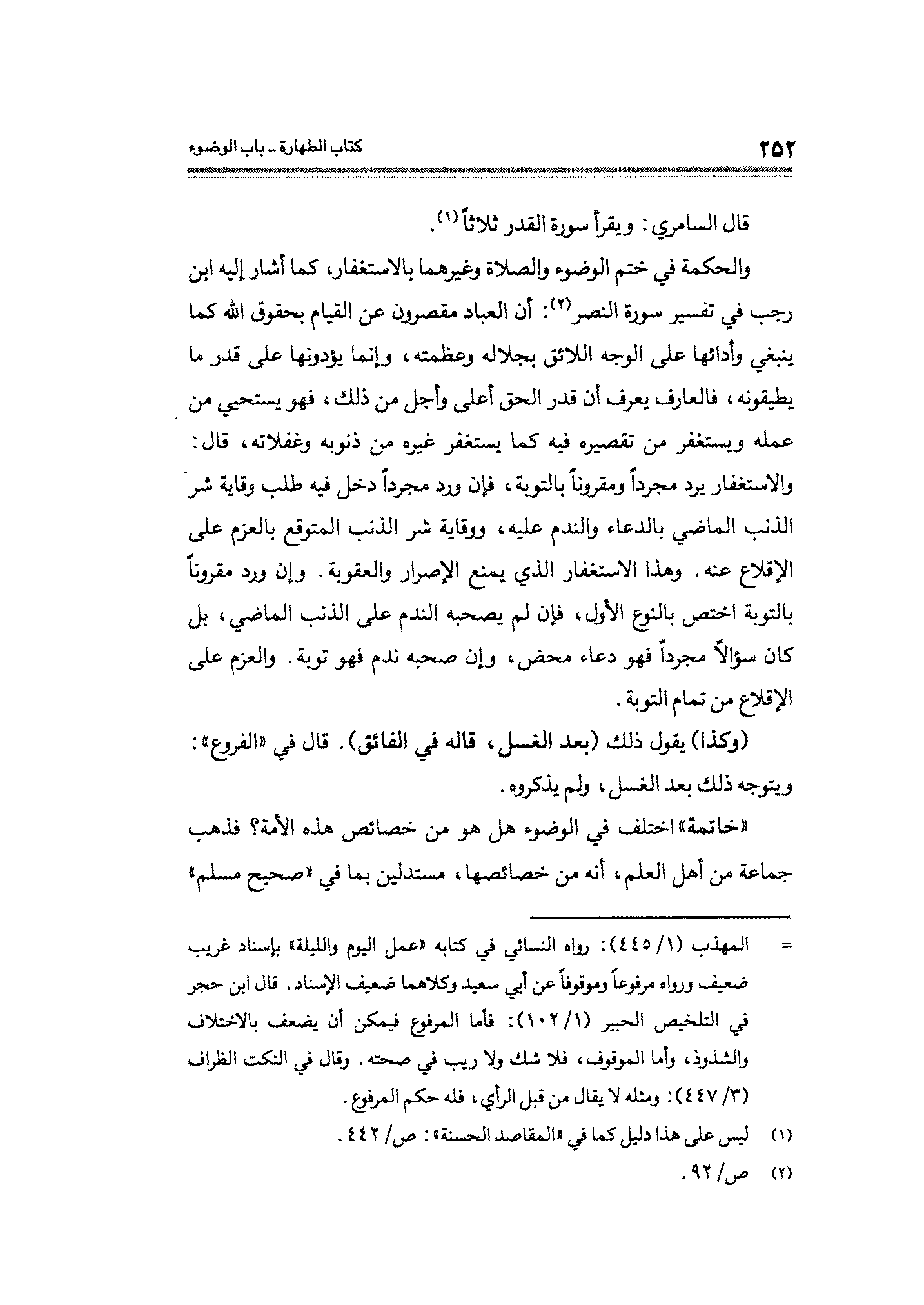 والحكمة في ختم الوضوء والصلاة وغيرهما بالاستغفار، كما أشار إليه ابن رجب في تفسير سورة النصر (¬٢): أن العباد مقصرون عن القيام بحقوق الله كما ينبغي وأدائها على الوجه اللائق بجلاله وعظمته، وإنما يؤدونها على قدر ما يطيقونه، فالعارف يعرف أن قدر الحق أعلى وأجل من ذلك، فهو يستحيي من عمله ويستغفر من تقصيره فيه كما يستغفر غيره من ذنوبه وغفلاته، قال: والاستغفار يرد مجردًا ومقرونًا بالتوبة، فإن ورد مجردًا دخل فيه طلب وقاية شر الذنب الماضي بالدعاء والندم عليه، ووقاية شر الذنب المتوقع بالعزم على الإقلاع عنه. وهذا الاستغفار الذي يمنع الإصرار والعقوية. وإن ورد مقرونًا بالتوبة اختص بالنوع الأول، فإن لم يصحبه الندم على الذنب الماضي، بل كان سؤالًا مجردًا فهو دعاء محض، وإن صحبه ندم فهو توبة. والعزم على الإقلاع من تمام التوبة.