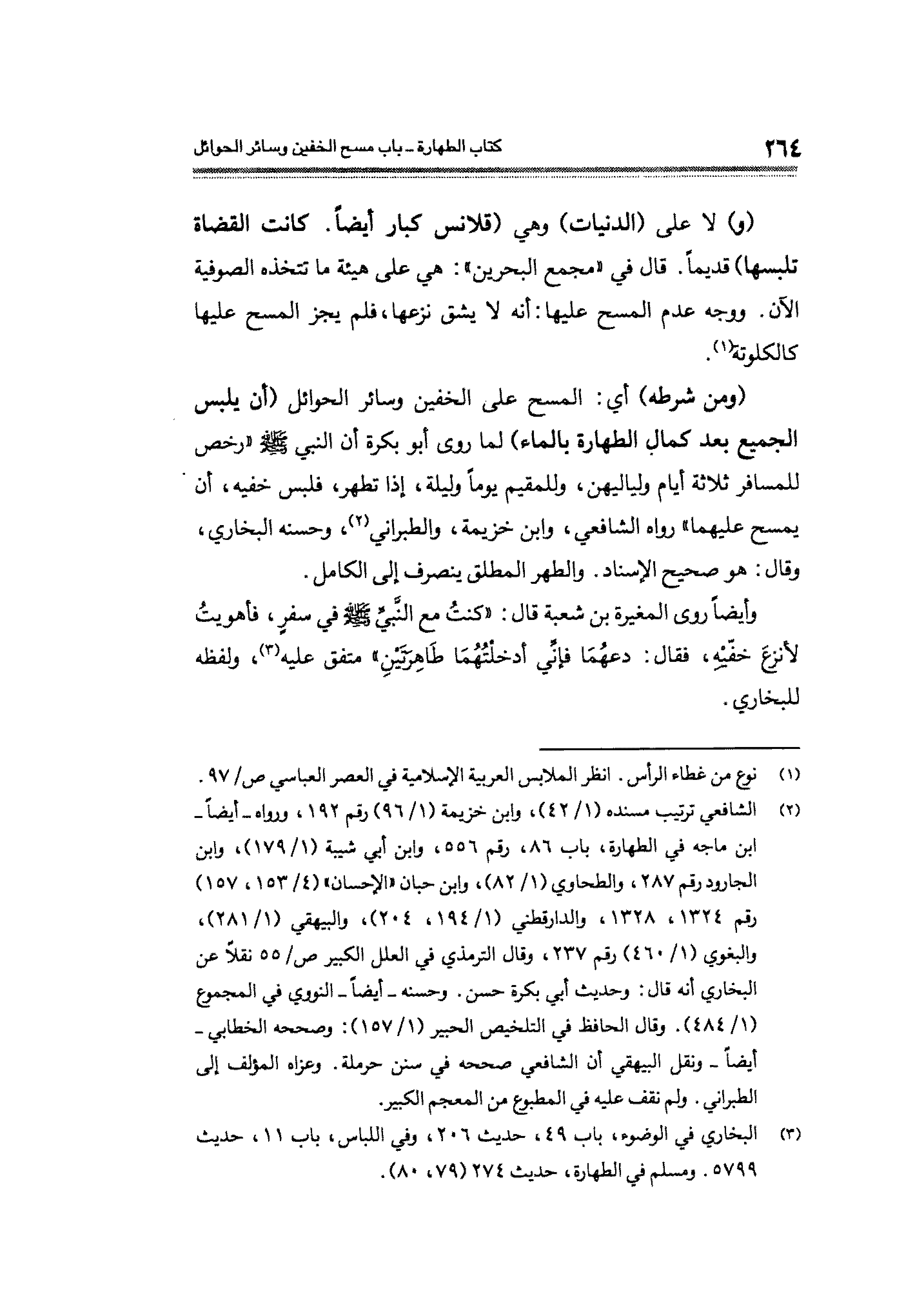 (ومن شرطه) أي: المسح على الخفين وسائر الحوائل (أن يلبس الجميع بعد كمال الطهارة بالماء) لما روى أبو بكرة أن النبي - صلى الله عليه وسلم - "رخص للمسافر ثلاثة أيام ولياليهن، وللمقيم يومًا وليلة، إذا تطهر، فلبس خفيه، أن يمسح عليهما" رواه الشافعي، وابن خزيمة، والطبراني (¬٢)، وحسنه البخاري، وقال: هو صحيح الإسناد. والطهر المطلق ينصرف إلى الكامل.