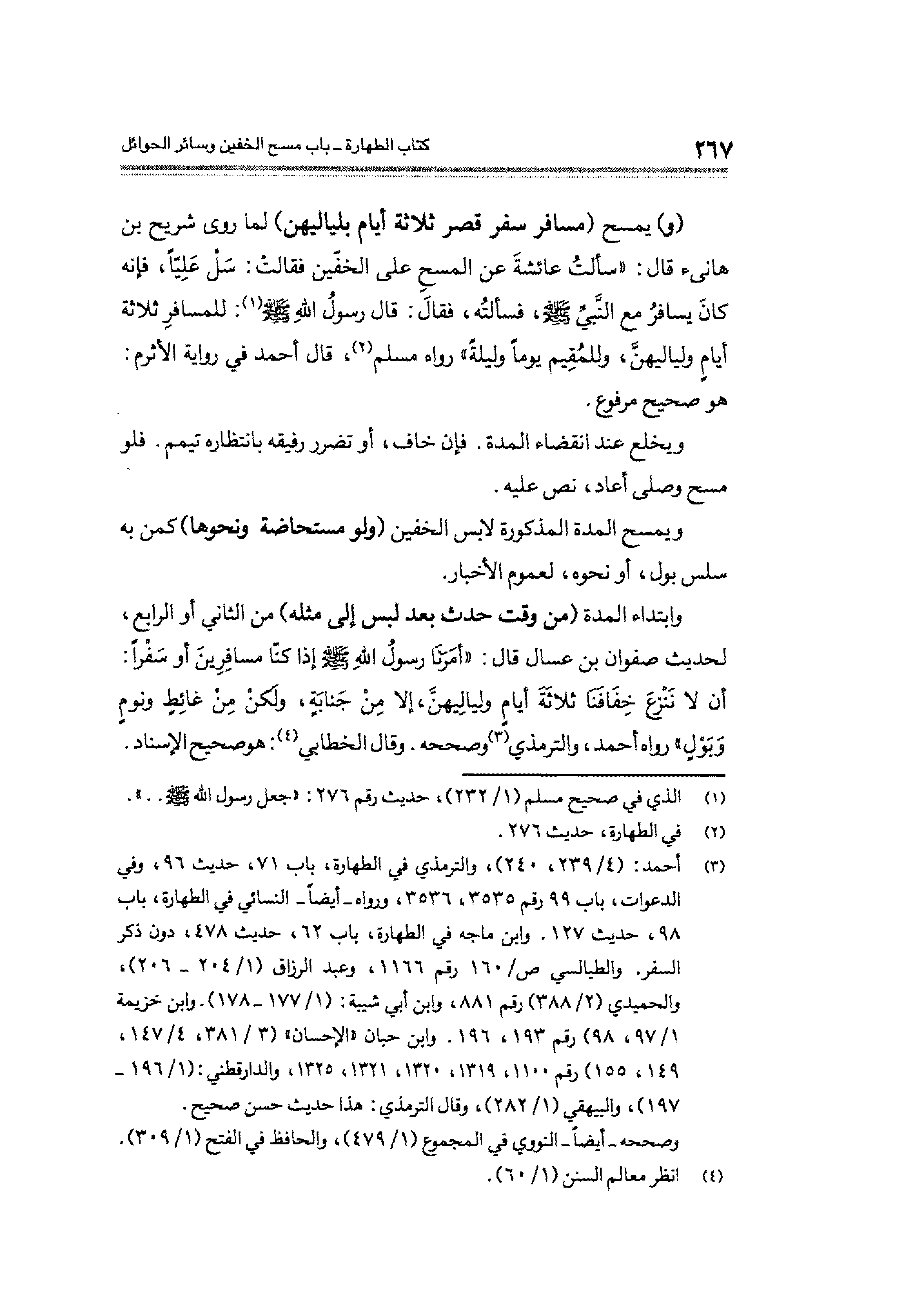 (و) يمسح (مسافر سفر قصر ثلاثة أيام بلياليهن) لما روى شريح بن هانئ قال: "سألتُ عائشةَ عن المسحِ على الخفّين فقالت: سَلْ عَليًّا، فإنه كان يسافرُ مع النَّبيِّ - صلى الله عليه وسلم -، فسألتُه، فقالَ: قال رسولُ اللهِ - صلى الله عليه وسلم - (¬١): للمسافرِ ثلاثة أيام ولياليهنَّ، وللمُقِيم يوماً وليلةً" رواه مسلم (¬٢)، قال أحمد في رواية الأثرم: هو صحيح مرفوع.