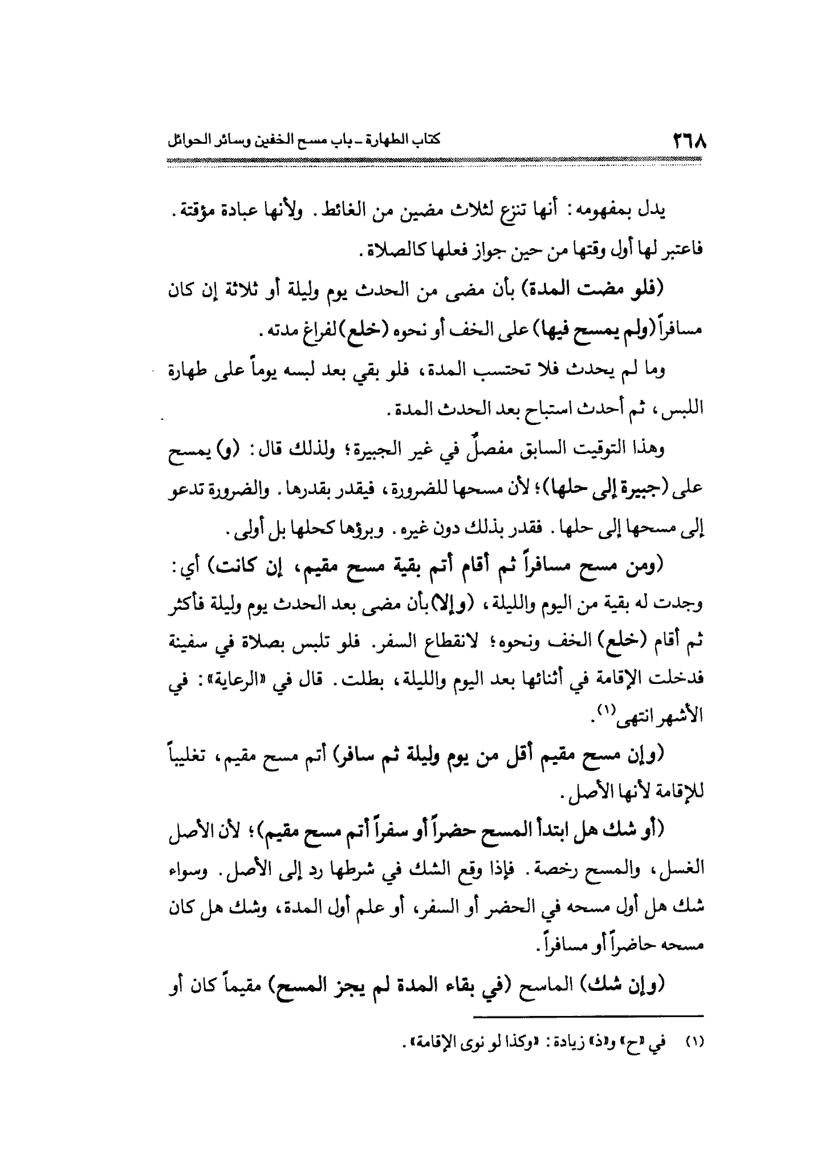 (أوشك هل ابتدأ المسح حضراً أو سفراً أتم مسح مقيم)؛ لأن الأصل الغسل، والمسح رخصة. فإذا وقع الشك في شرطها رد إلى الأصل. وسواء شك هل أول مسحه في الحضر أو السفر، أو علم أول المدة، وشك هل كان مسحه حاضراً او مسافراً.