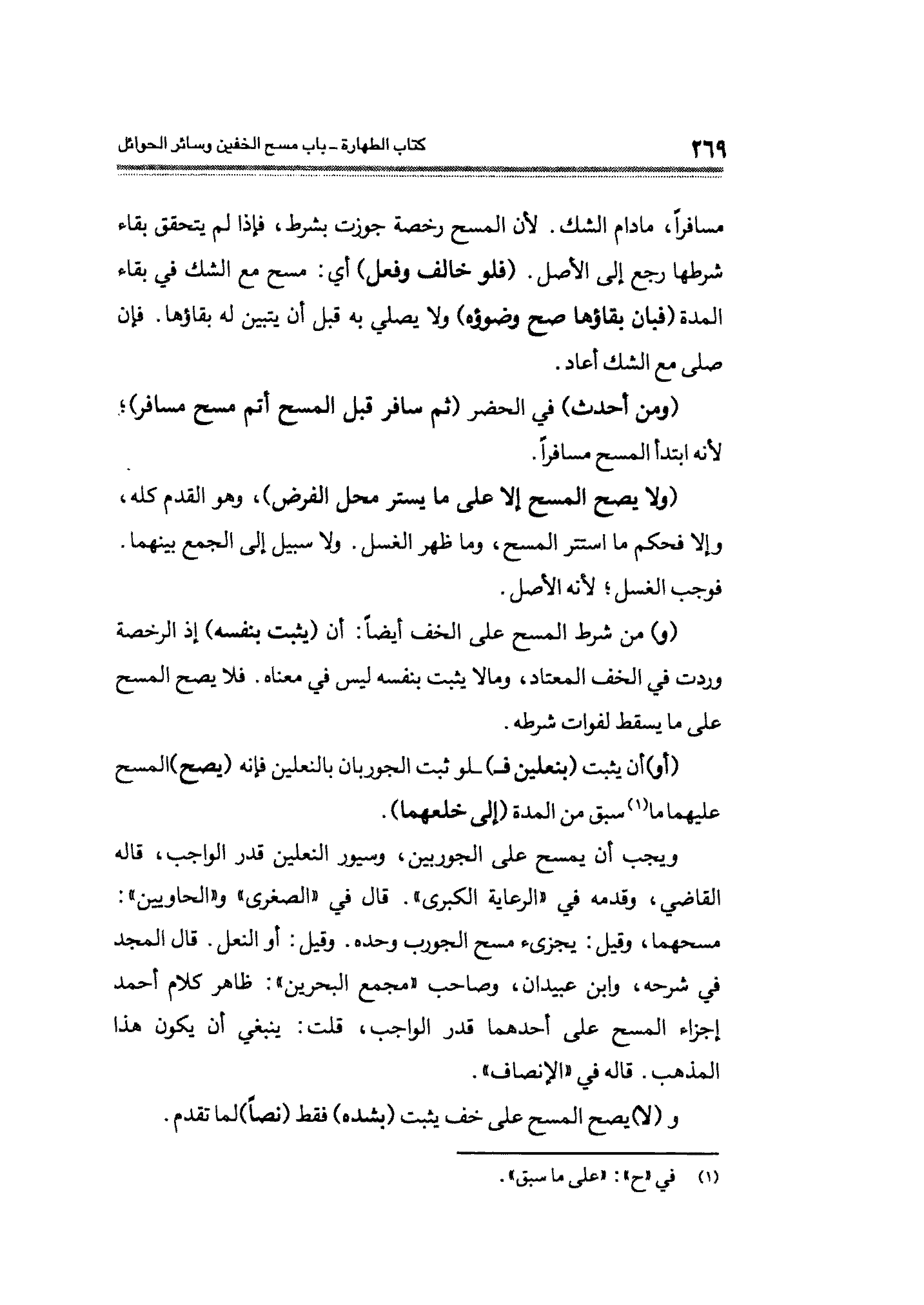 مسافرًا، مادام الشك. لأن المسح رخصة جوزت بشرط، فإذا لم يتحقق بقاء شرطها رجع إلى الأصل. (فلو خالف وفعل) أي: مسح مع الشك في بقاء المدة (فبان بقاؤها صح وضوؤه) ولا يصلي به قبل أن يتبين له بقاؤها، فإن صلى مع الشك أعاد.