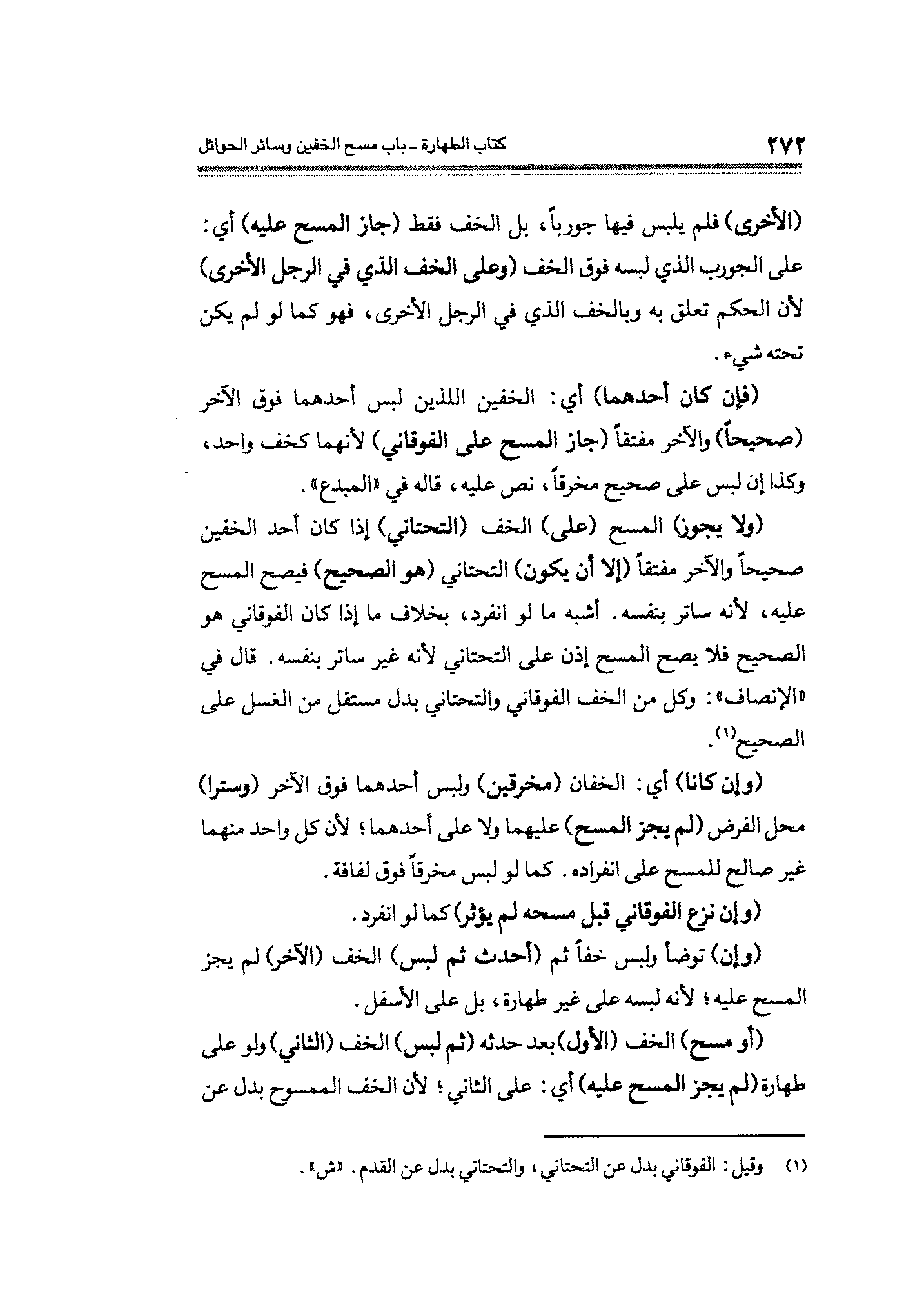 (ولا يجوز) المسح (على) الخف (التحتاني) إذا كان أحد الخفين صحيحًا والآخر مفتقًا (إلا أن يكون) التحتاني (هو الصحيح) فيصح المسح عليه، لأنه ساتر بنفسه. أشبه ما لو انفرد، بخلاف ما إذا كان الفوقاني هو الصحيح فلا يصح المسح أذن على التحتاني لأنه غير ساتر بنفسه. قال في "الإنصاف": وكل من الخف الفوقاني والتحتاني بدل مستقل من الغسل على الصحيح (¬١).
