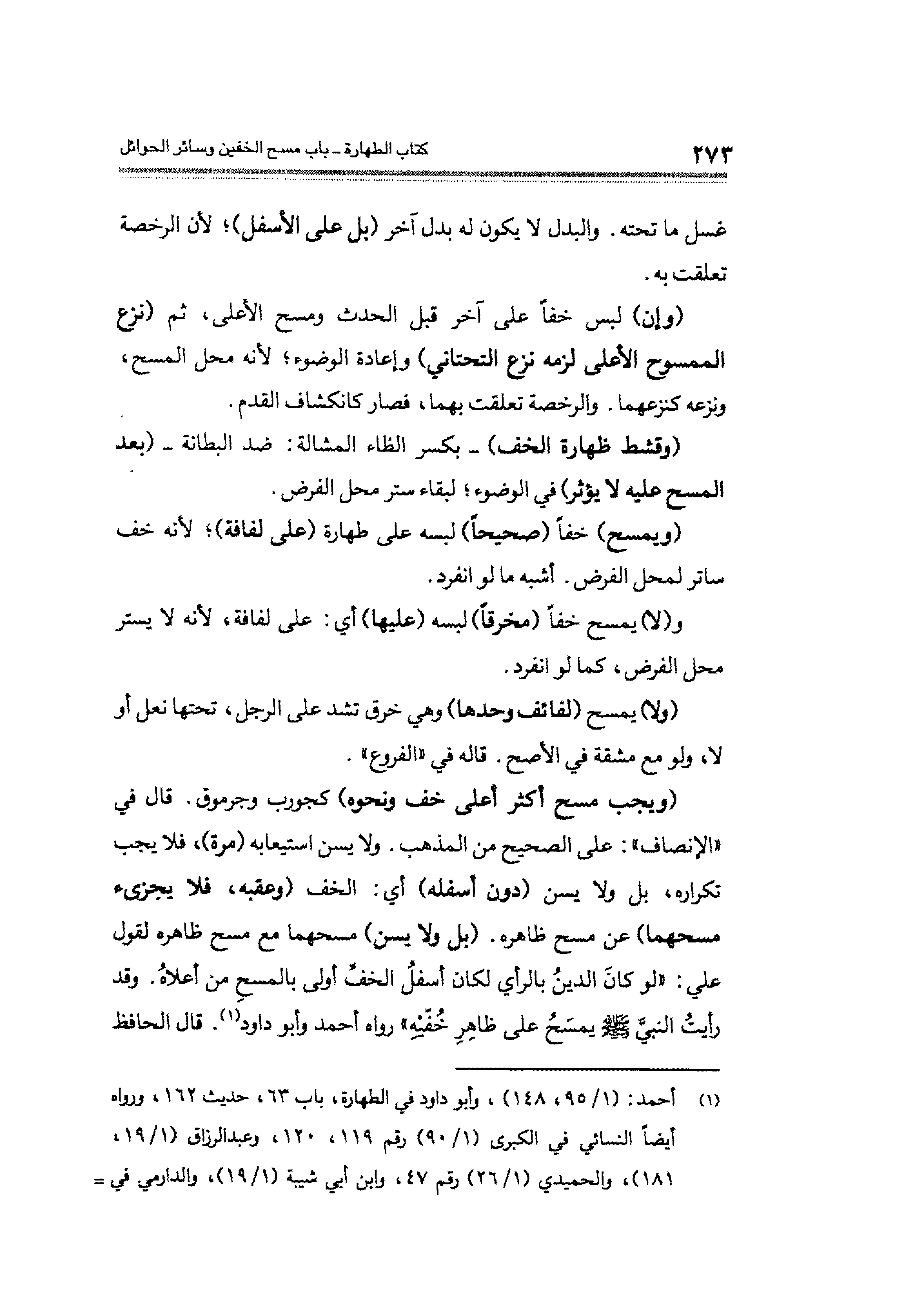(ويجب مسح أكثر أعلى خف ونحوه) كجورب وجرموق. قال في "الإنصاف": على الصحيح من المذهب. ولا يسن استيعابه (مرة)، فلا يجب تكراره، بل ولا يسن (دون أسفله) أي: الخف (وعقبه، فلا يجزئ مسحهما) عن مسح ظاهره. (بل ولا يسن) مسحهما مع مسح ظاهره لقول علي: "لو كانَ الدينُ بالرأي لكان أسفلُ الخفِّ أولى بالمسحِ من أعلاهُ. وقد رأيتُ النبيَّ - صلى الله عليه وسلم - يمسَحُ على ظاهِرِ خُفّيْهِ" رواه أحمد وأبو داود (¬١). قال الحافظ