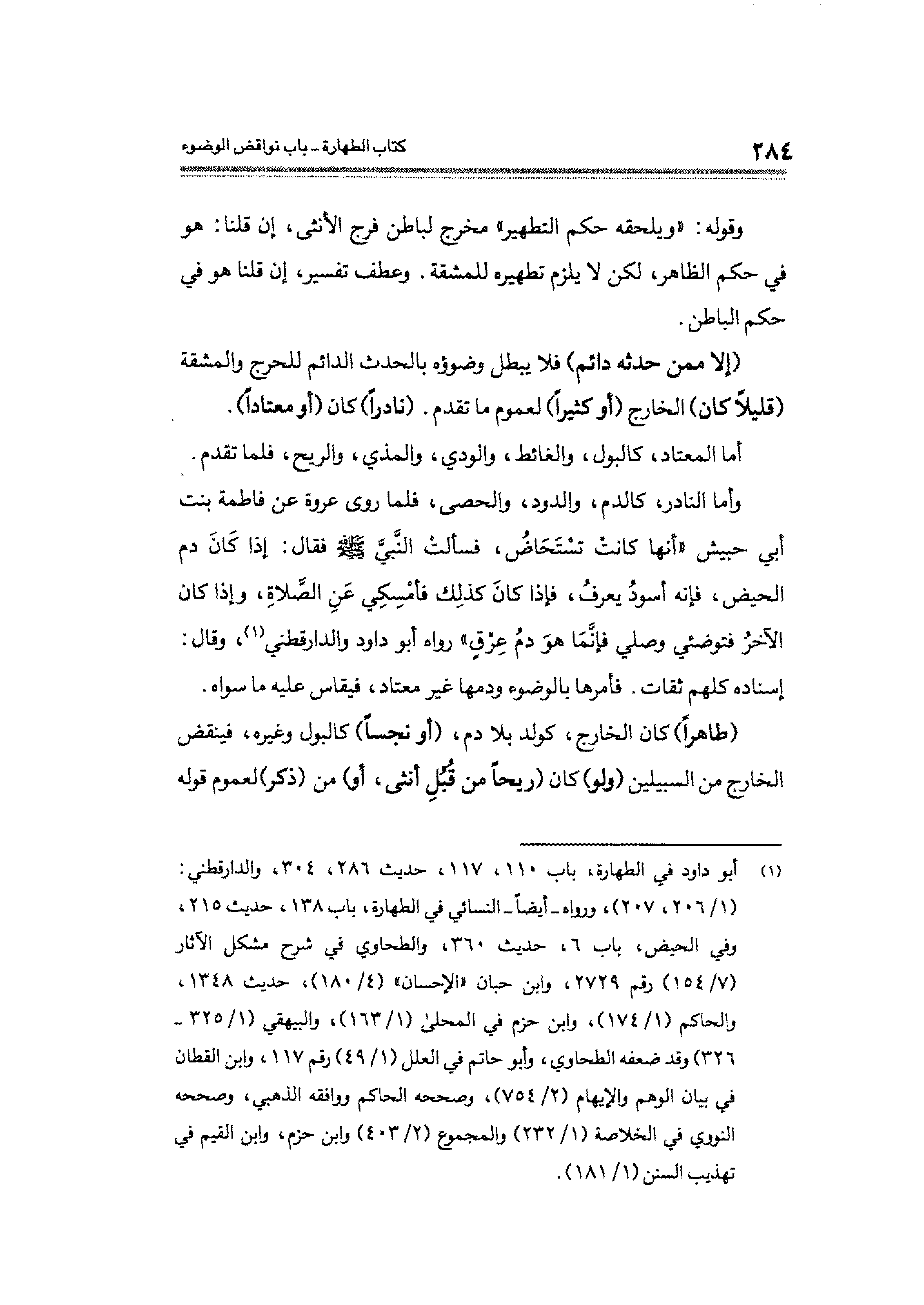 (¬١) أبو داود في الطهارة، باب ١١٠، ١١٧، حديث ٢٨٦، ٣٠٤، والدارقطني: (١/ ٢٠٦، ٢٠٧)، ورواه -أيضًا- الثَّاني في الطهارة، باب ١٣٨، حديث ٢١٥، وفي الحيض، باب ٦، حديث ٣٦٠، والطحاوي في شرح مشكل الآثار (٧/ ١٥٤) رقم ٢٧٢٩، وابن حبان "الإحسان" (٤/ ١٨٠)، حديث ١٣٤٨، والحاكم (١/ ١٧٤)، وابن حزم في المحلى (١/ ١٦٣)، والبيهقي (١/ ٣٢٥ - ٣٢٦) وقد ضعَّفه الطحاوي، وأبو حاتم في العلل (١/ ٤٩) رقم ١١٧، وابن القطان في بيان الوهم والإيهام (٢/ ٧٥٤)، وصححه الحكم ووافقه الذهبي، وصححه النووي في الخلاصة (١/ ٢٣٢) والمجموع (٢/ ٤٠٣) وابن حزم، وابن القيِّم في تهذيب السنن (١/ ١٨١).