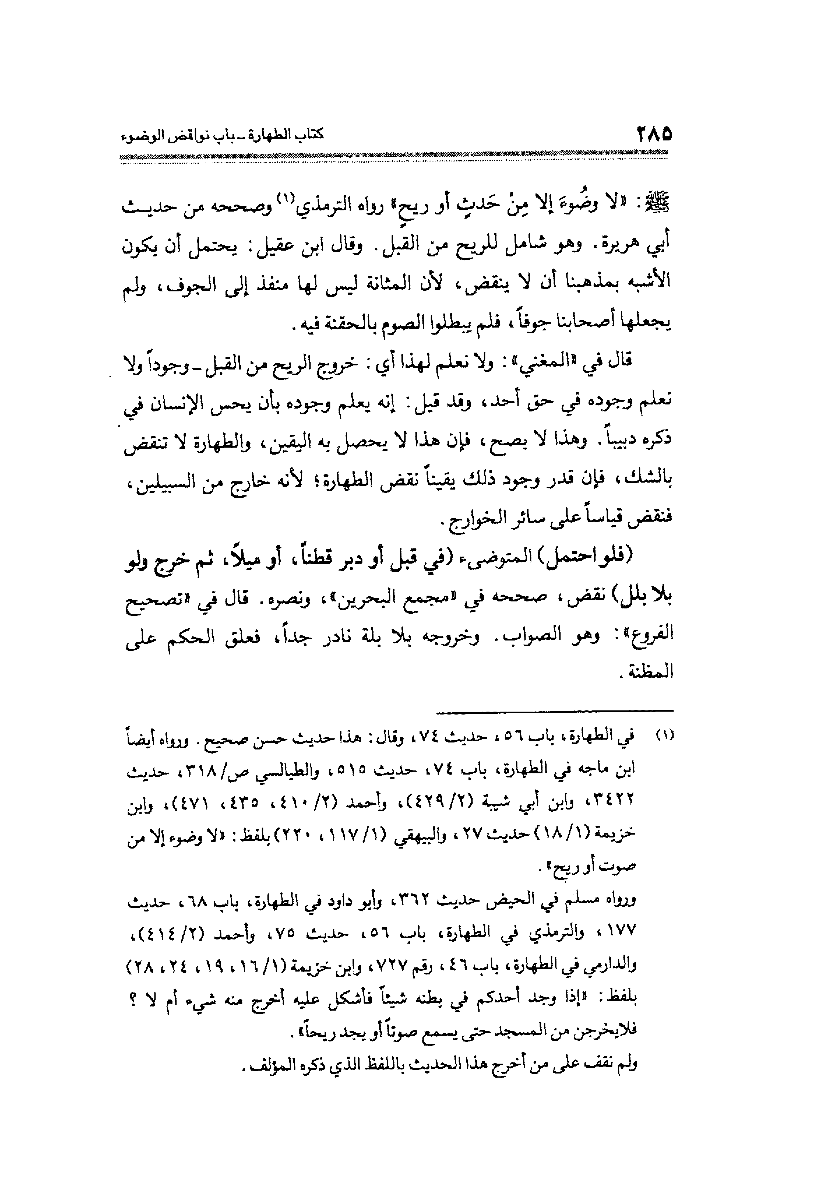 ورواه مسلم في الحيض حديث ٣٦٢، وأبو داود في الطهارة، باب ٦٨، حديث ١٧٧، والترمذي في الطهارة، باب ٥٦، حديث ٧٥، وأحمد (٢/ ٤١٤)، والدارمي في الطهارة، باب ٤٦، رقم ٧٢٧، وابن خزيمة (١/ ١٦، ١٩، ٢٤، ٢٨) بلفظ: "إذا وجد أحدكم في بطنه شيئاً فأشكل عليه أخرج منه شيء أم لا؟ فلا يخرجن من المسجد حتَّى يسمع صوتاً أو يجد ريحاً".