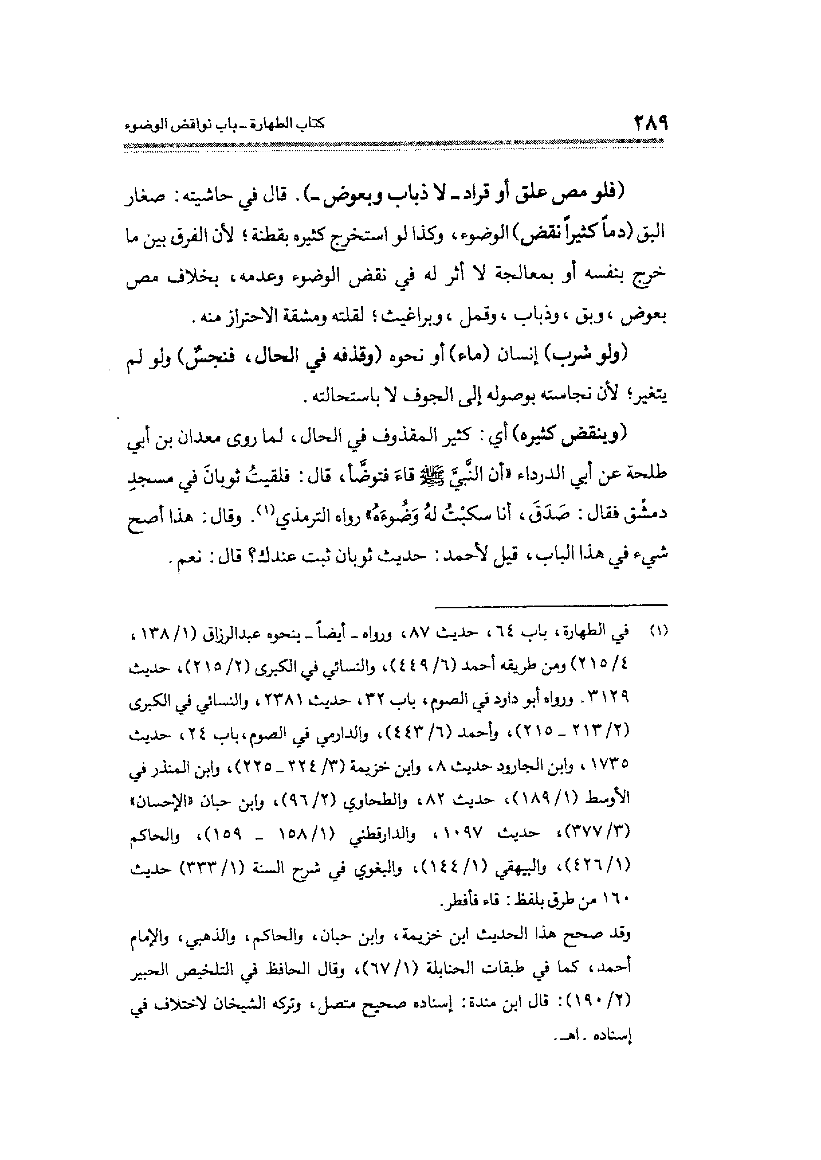 (وينقض كثيره) أي: كثير المقذوف في الحال، لما روى معدان بن أبي طلحة عن أبي الدرداء (أن النَّبيَّ - صلى الله عليه وسلم - قاءَ فتوضَّأ، قال: فلقيتُ ثوبانَ في مسجدِ دمشق فقال: صَدَقَ، أنا سكبْتُ لهُ وَضوءَهُ" رواه الترمذي (¬١). وقال: هذا أصح شيء في هذا الباب، قيل لأحمد: حديث ثوبان ثبت عندك؟ قال: نعم.