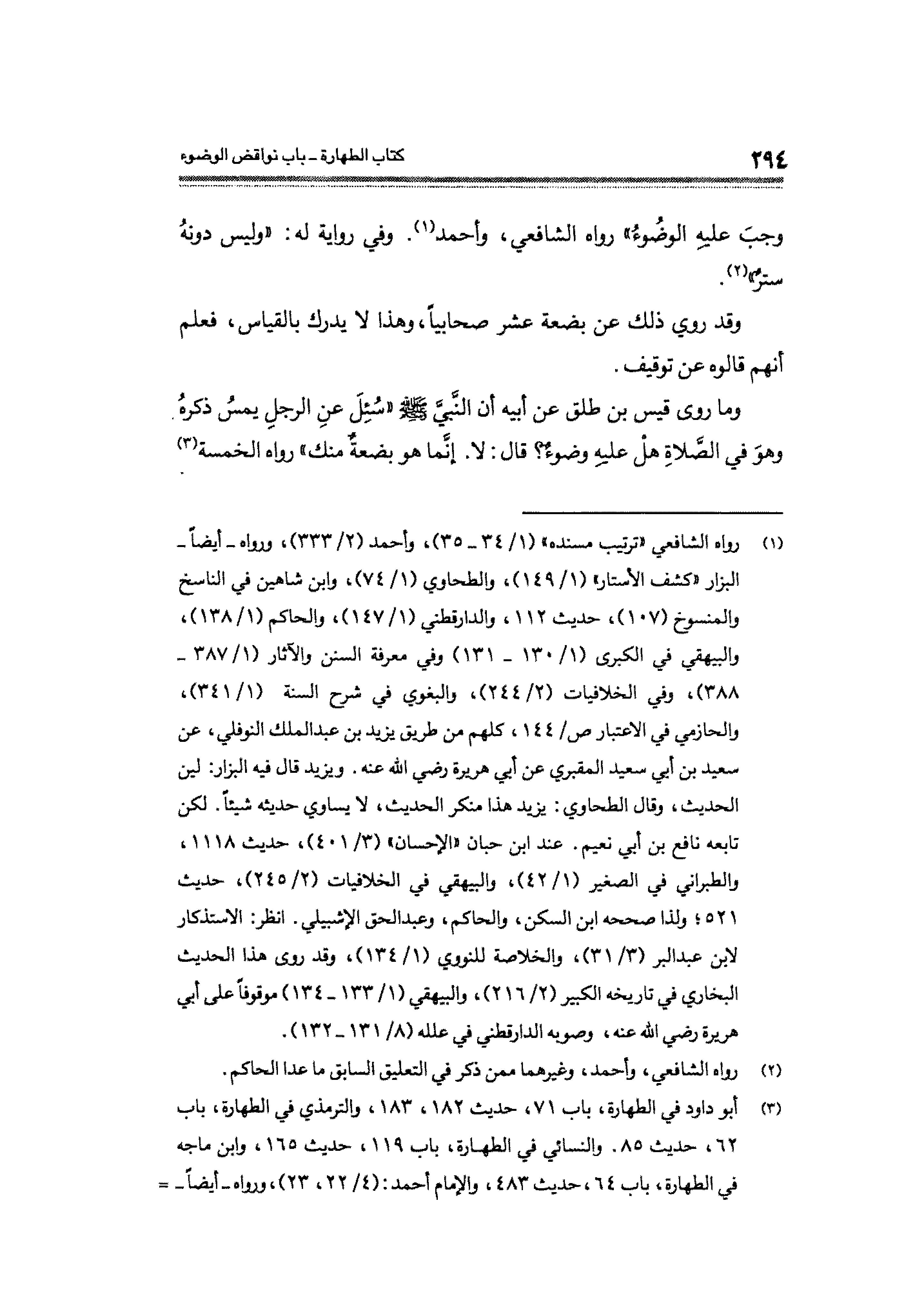 وما روى قيس بن طلق عن أبيه أن النَّبيَّ - صلى الله عليه وسلم - "سُئِلَ عنِ الرجلِ يمسُ ذكرهُ وهوَ في الصَّلاةِ هلْ عليهِ وضوءٌ قال: لا. إنَّما هو بضعةٌ منك" رواه الخمسة (¬٣)