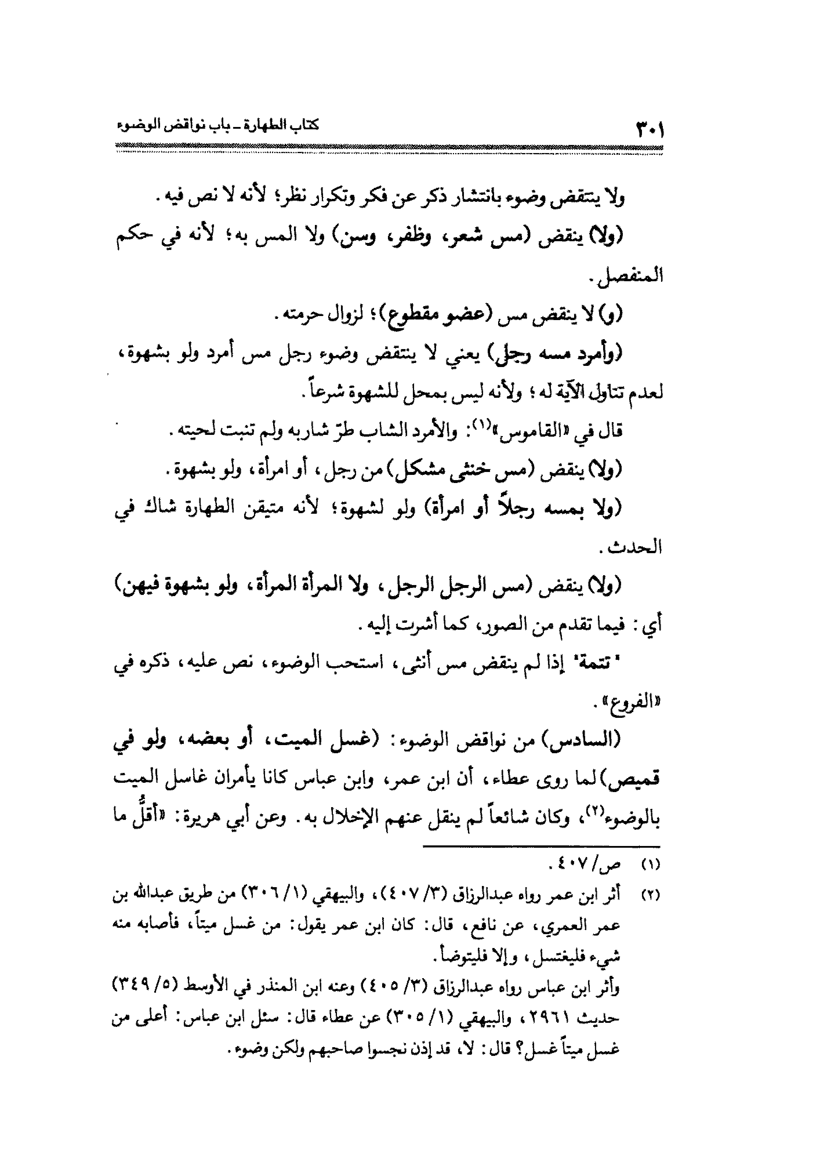 (وأمرد مسه رجل) يعني لا ينتفض وضوء رجل مس أمرد ولو بشهوة، لعدم تناول الآية له؛ ولأنه ليس بمحل للشهوة شرعاً.