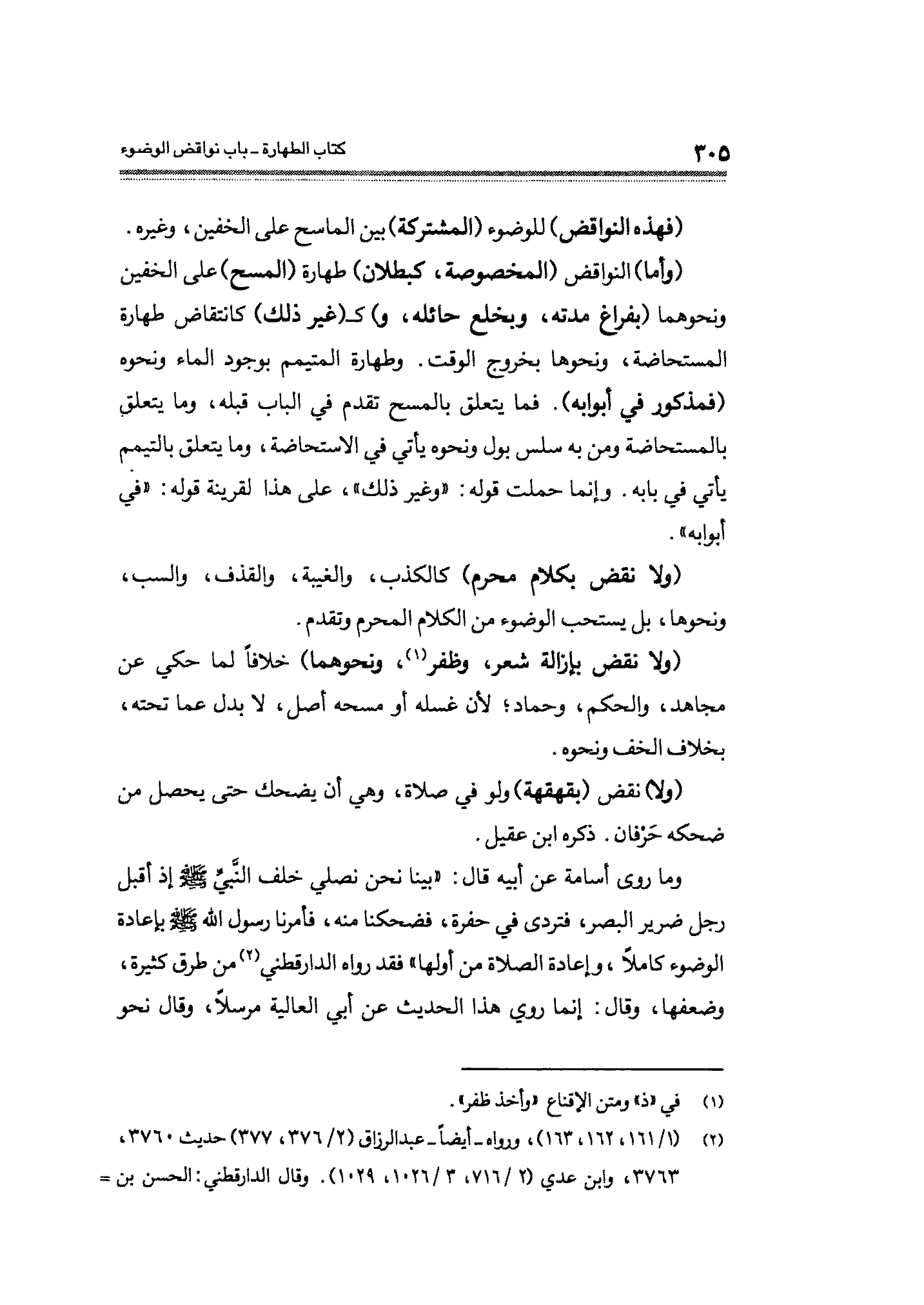 (وأما) النواقض (المخصوصة، كبطلان) طهارة (المسح) على الخفين ونحوهما (بفراغ مدته، وبخلع حائله، و) كـ (غير ذلك) كانتفاض طهارة المستحاضة، ونحوها بخروج الوقت. وطهارة المتيمم بوجود الماء ونحوه (فمذكور في أبوابه). فما يتعلق بالمسح تقدم في الباب قبله، وما يتعلق بالمستحاضة ومن به سلس بول ونحوه يأتي في الاستحاضة، وما يتعلق بالتيمم يأتي في بابه. وإنما حملت قوله: "وغير ذلك"، على هذا لقرينة قوله: "في أبوابه".