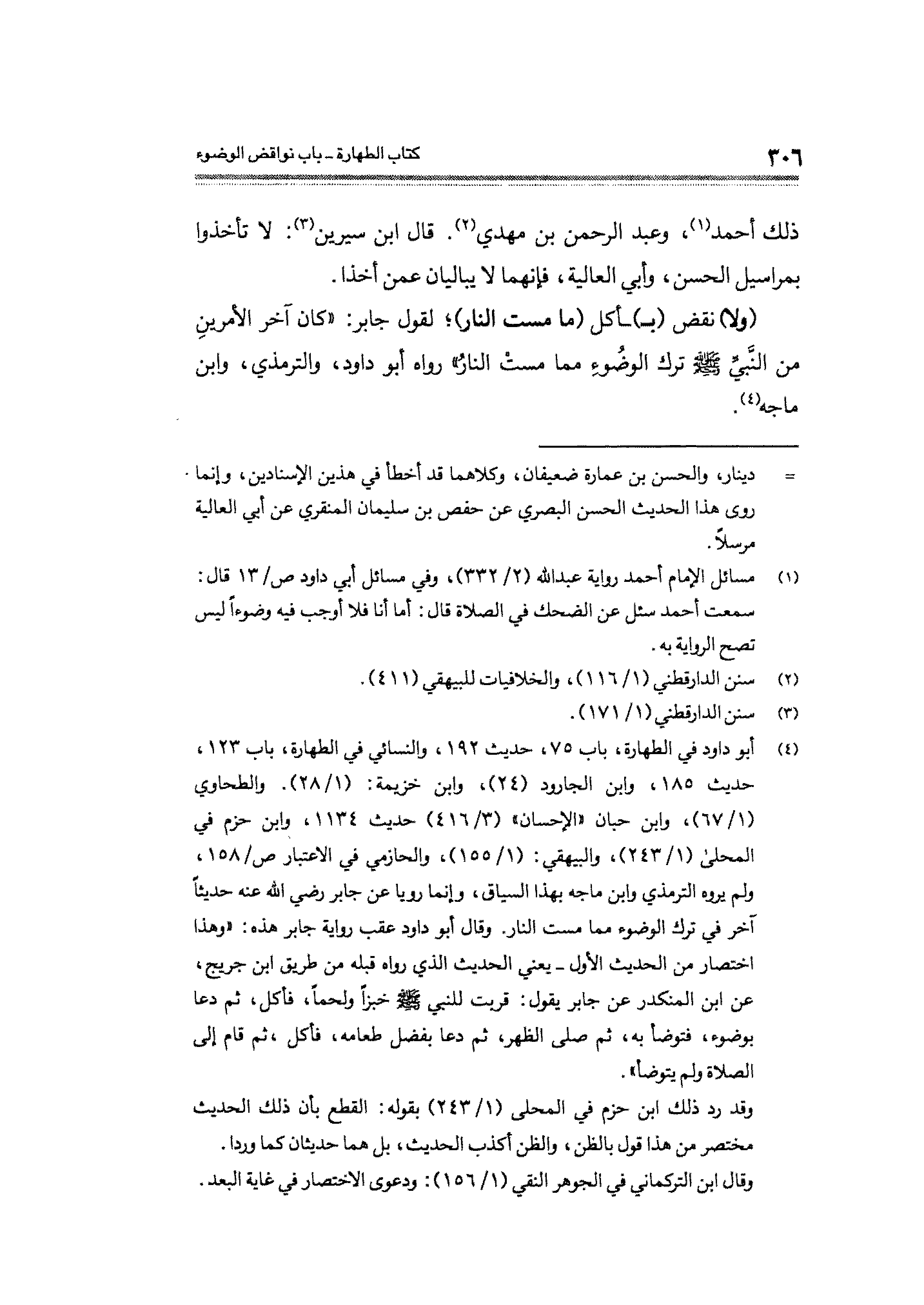 (¬٤) أبو داود في الطهارة، باب ٧٥، حديث ١٩٢، والنسائي في الطهارة، باب ١٢٣، حديث ١٨٥، وابن الجارود (٢٤)، وابن خريمة: (١/ ٢٨). والطحاوي (١/ ٦٧)، وابن حبان "الإحسان" (٣/ ٤١٦) حديث ١١٣٤، وابن حزم في المحلى (١/ ٢٤٣)، والبيهقي: (١/ ١٥٥)، والحازمي في الاعتبار ص/١٥٨، ولم يروه الترمذى وابن ماجه بهذا السياق، وإنما رويا عن جابر رضي الله عنه حديثاً آخر في ترك الوضوء مما مست النار. وقال أبو داود عقب رواية جابر هذه: "وهذا اختصار من الحديث الأول -يعني الحديث الذي رواه قبله من طريق ابن جريج، عن ابن المنكدر عن جابر يقول: قربت للنبي - صلى الله عليه وسلم - خبزًا ولحماً، فأكل، ثم دعا بوضوء، فتوضأ به، ثم صلى الظهر، ثم دعا بفضل طعامه، فأكل، ثم قام إلى الصلاة ولم يتوضأ".