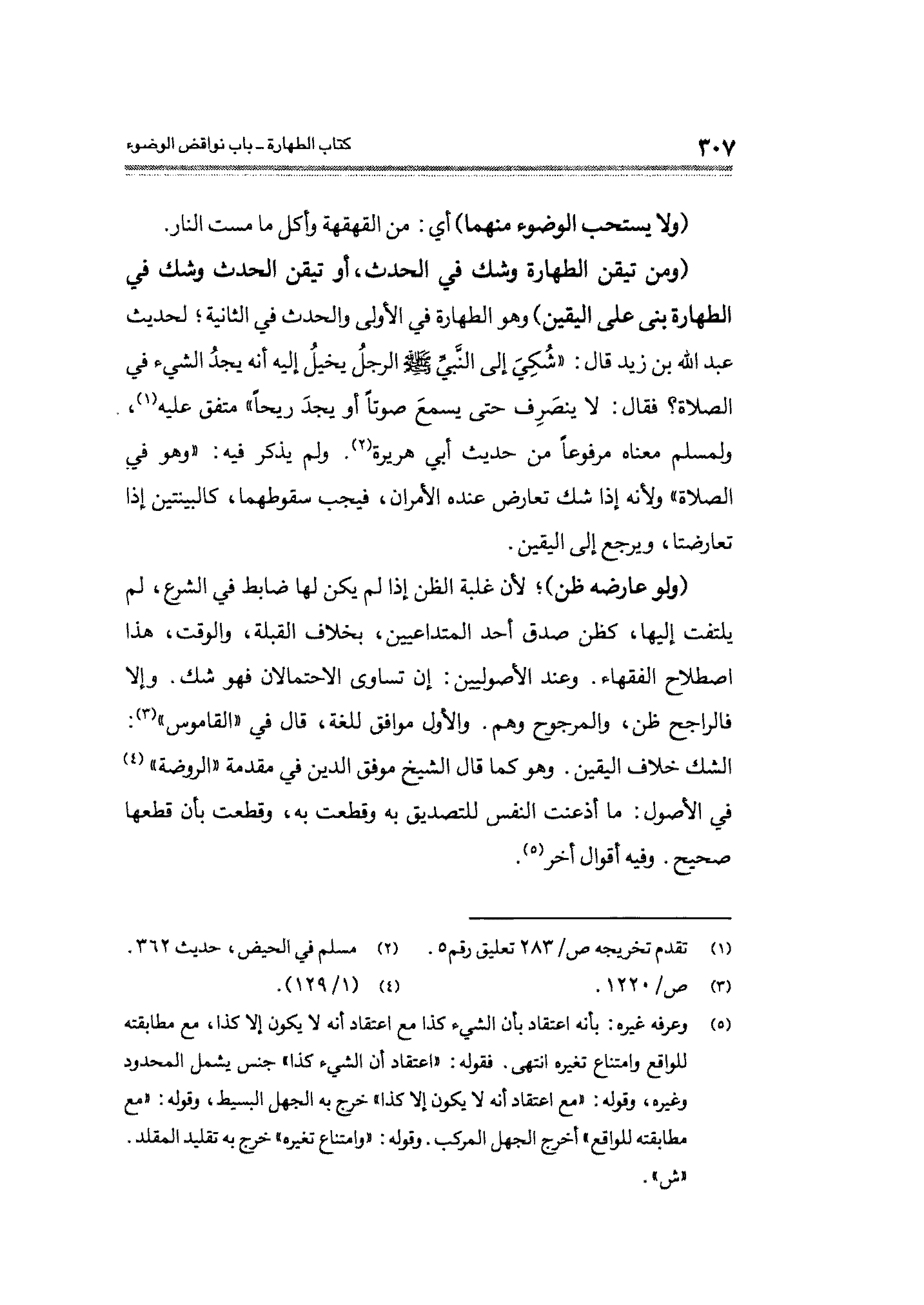 (ولو عارضه ظن)؛ لأن غلبة الظن إذا لم يكن لها ضابط في الشرع، لم يلتفت إليها، كظن صدق أحد المتداعيين، بخلاف القبلة، والوقت، هذا اصطلاح الفقهاء. وعند الأصوليين: إن تساوى الاحتمالان فهو شك. وإلا فالراجح ظن، والمرجوح وهم. والأول موافق للغة، قال في "القاموس" (¬٣): الشك خلاف اليقين. وهو كما قال الشيخ موفق الدين في مقدمة "الروضة" (¬٤) في الأصول: ما أذعنت النفس للتصديق به. وقطعت به، وقطعت بأن قيطعها صحيح. وفيه أقوال أخر (¬٥).
