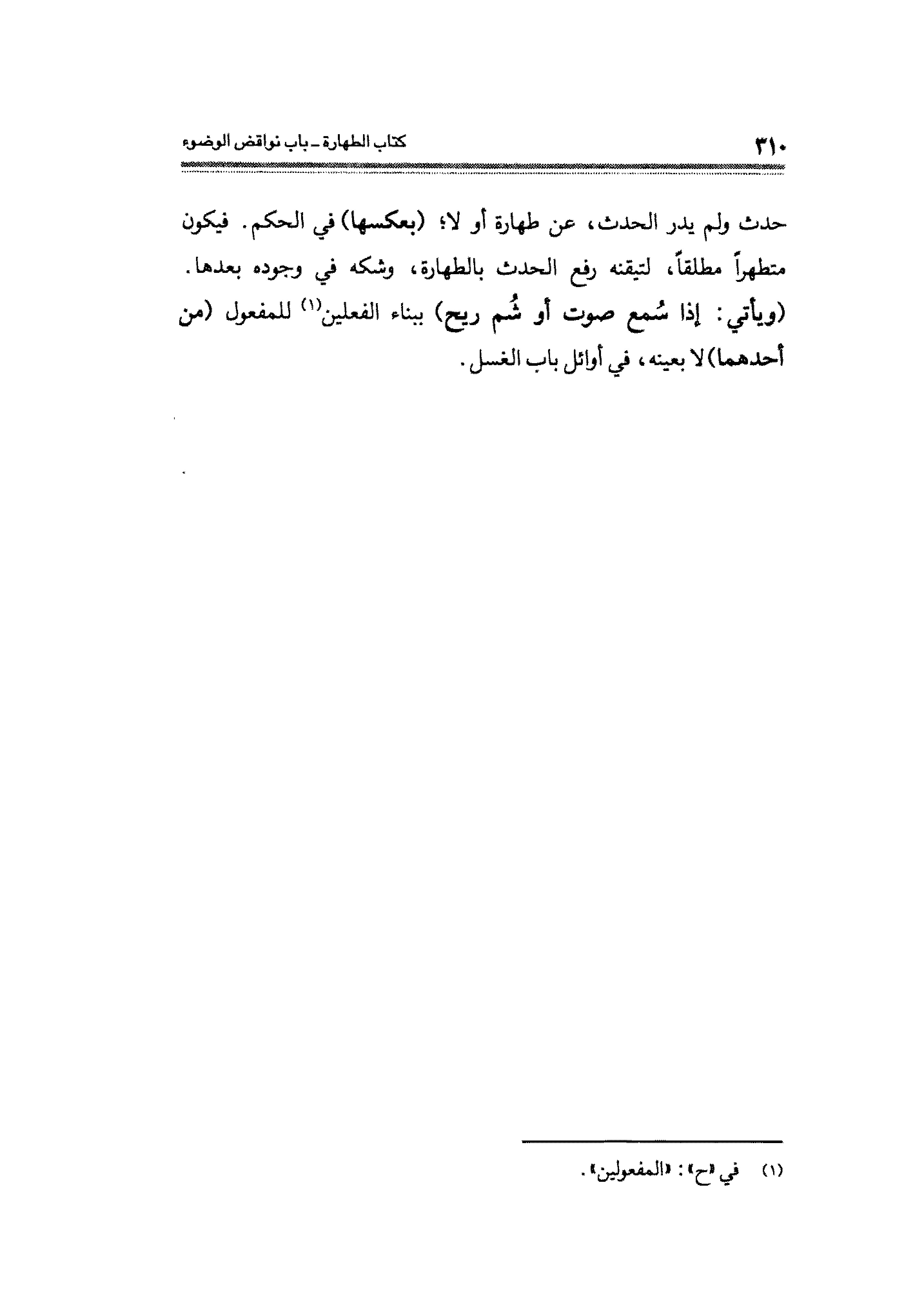 حدث ولم يدر الحدث، عن طهارة أو لا، (بعكسها) في الحكم. فيكون متطهرًا مطلقًا، لتيقنه رفع الحدث بالطهارة، وشكه في وجوده بعدها. (ويأتي: إذا سُمع صوت أو شُم ريح) ببناء الفعلين (¬١) للمفعول (من أحدهما) لا بعينه، في أوائل باب الغسل.