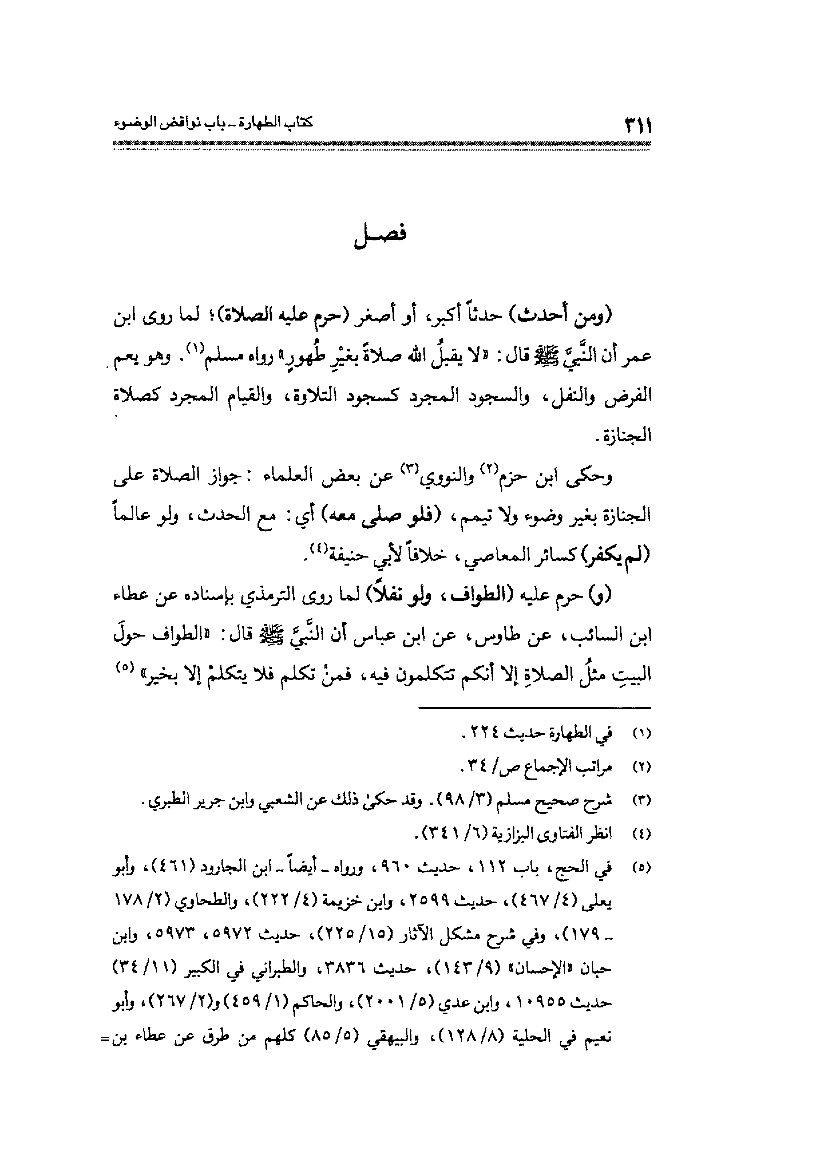 وحكى ابن حزم (¬٢) والنووي (¬٣) عن بعض العلماء: جواز الصلاة على الجنازة بغير وضوء ولا تيمم، (فلو صلى معه) أي: مع الحدث، ولو عالمًا (لم يكفر) كسائر المعاصي، خلافًا لأبي حنيفة (¬٤).