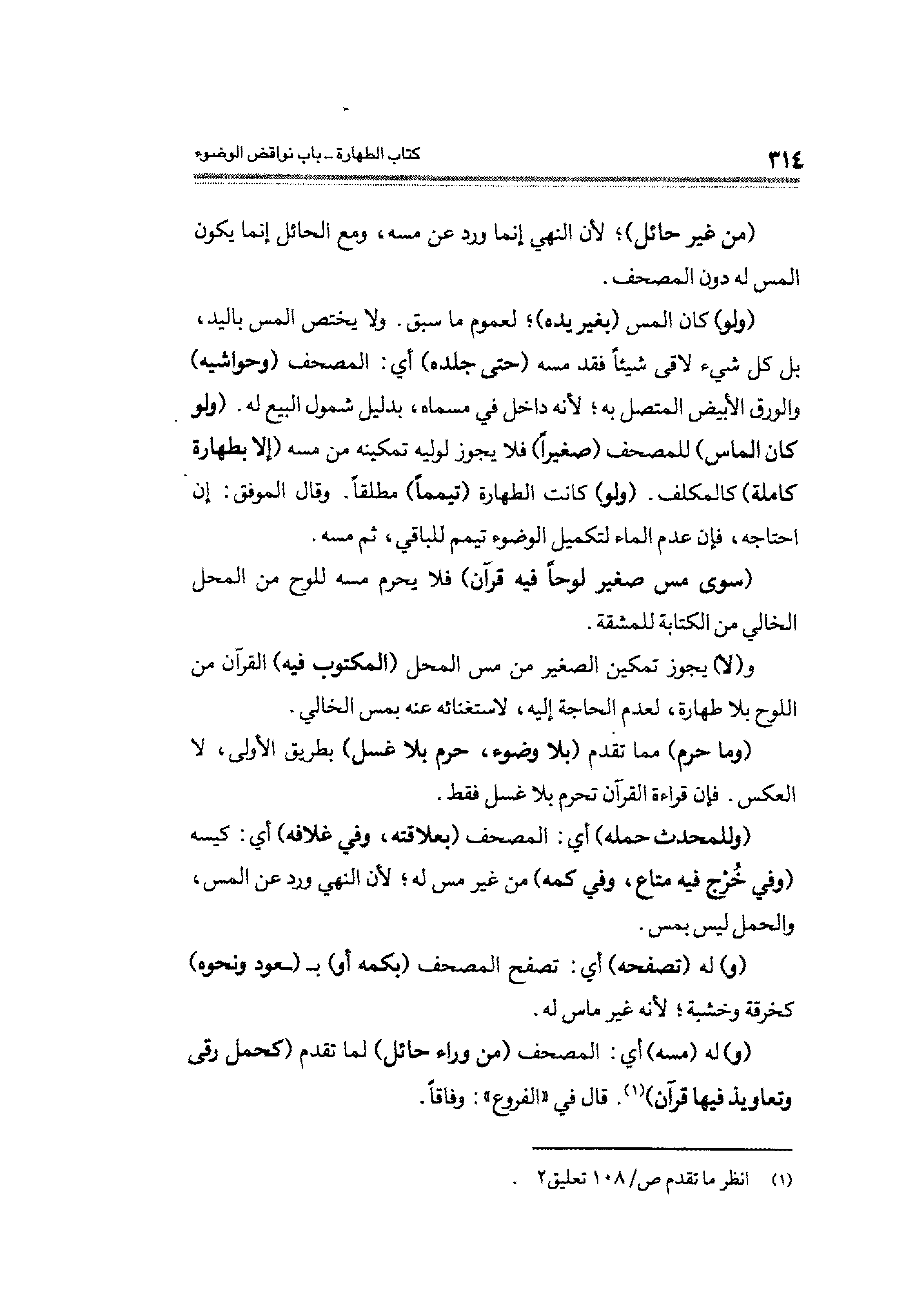 (ولو) كان المس (بغير يده)؛ لعموم ما سبق. ولا يختص المس باليد، بل كل شيء لاقى شيئًا فقد مسه (حتى جلده) أي: المصحف (وحواشيه) والورق الأبيض المتصل به؛ لأنه داخل في مسماه، بدليل شمول البيع له. (ولو كان الماس) للمصحف (صغيرًا) فلا يجوز لوليه تمكينه من مسه (إلا بطهارة كاملة) كالمكلف. (ولو) كانت الطهارة (تيممًا) مطلقًا. وقال الموفق: إن احتاجه، فإن عدم الماء لتكميل الوضوء تيمم للباقي، ثم مسه.