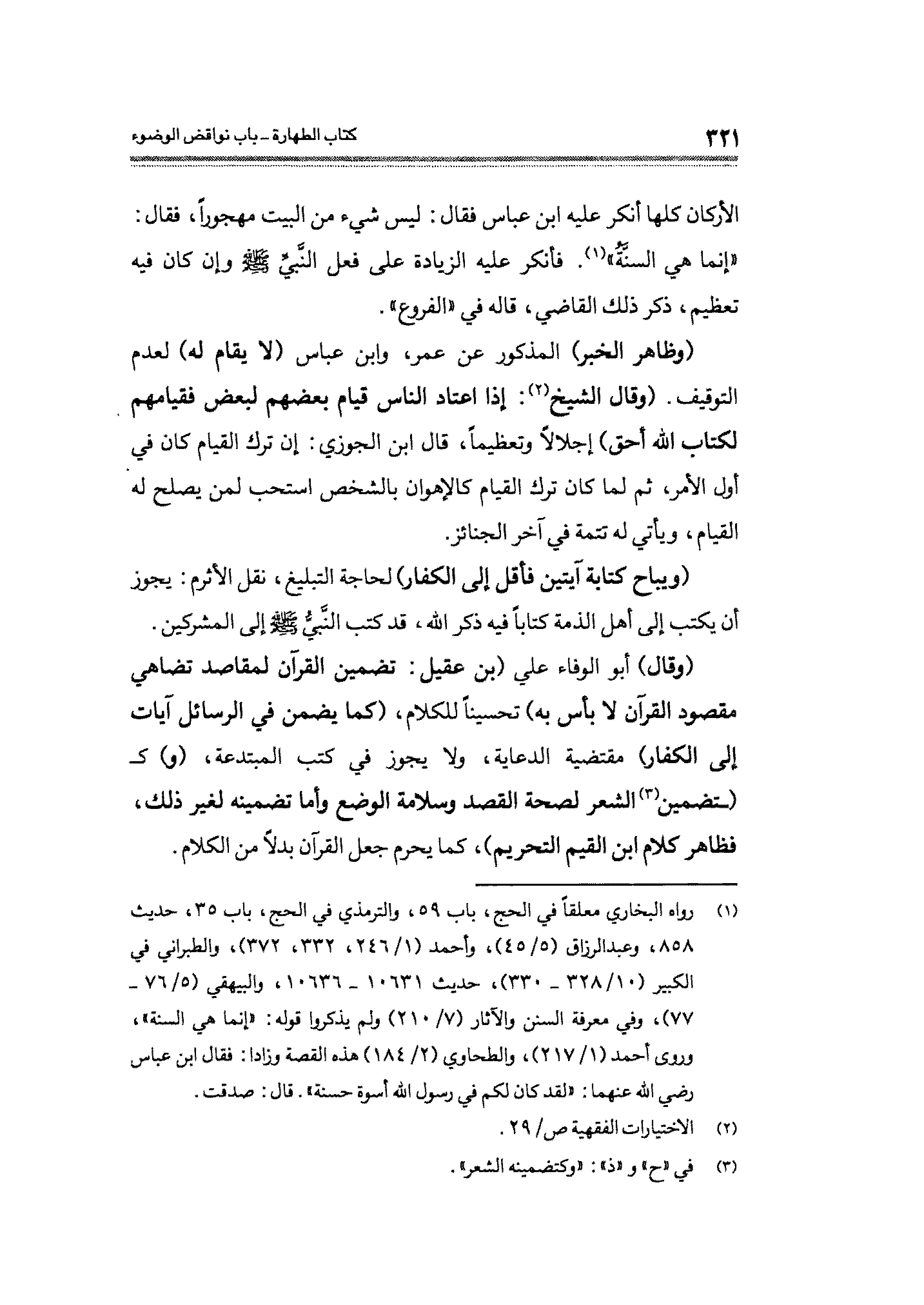 الأركان كلها أنكر عليه ابن عباس فقال: ليس شيء من البيت مهجورًا، فقال: "إنما هي السنَّةُ" (¬١). فأنكر عليه الزيادة على فعل النبيِّ - صلى الله عليه وسلم - وإن كان فيه تعظيم، ذكر ذلك القاضي، قاله في "الفروع".