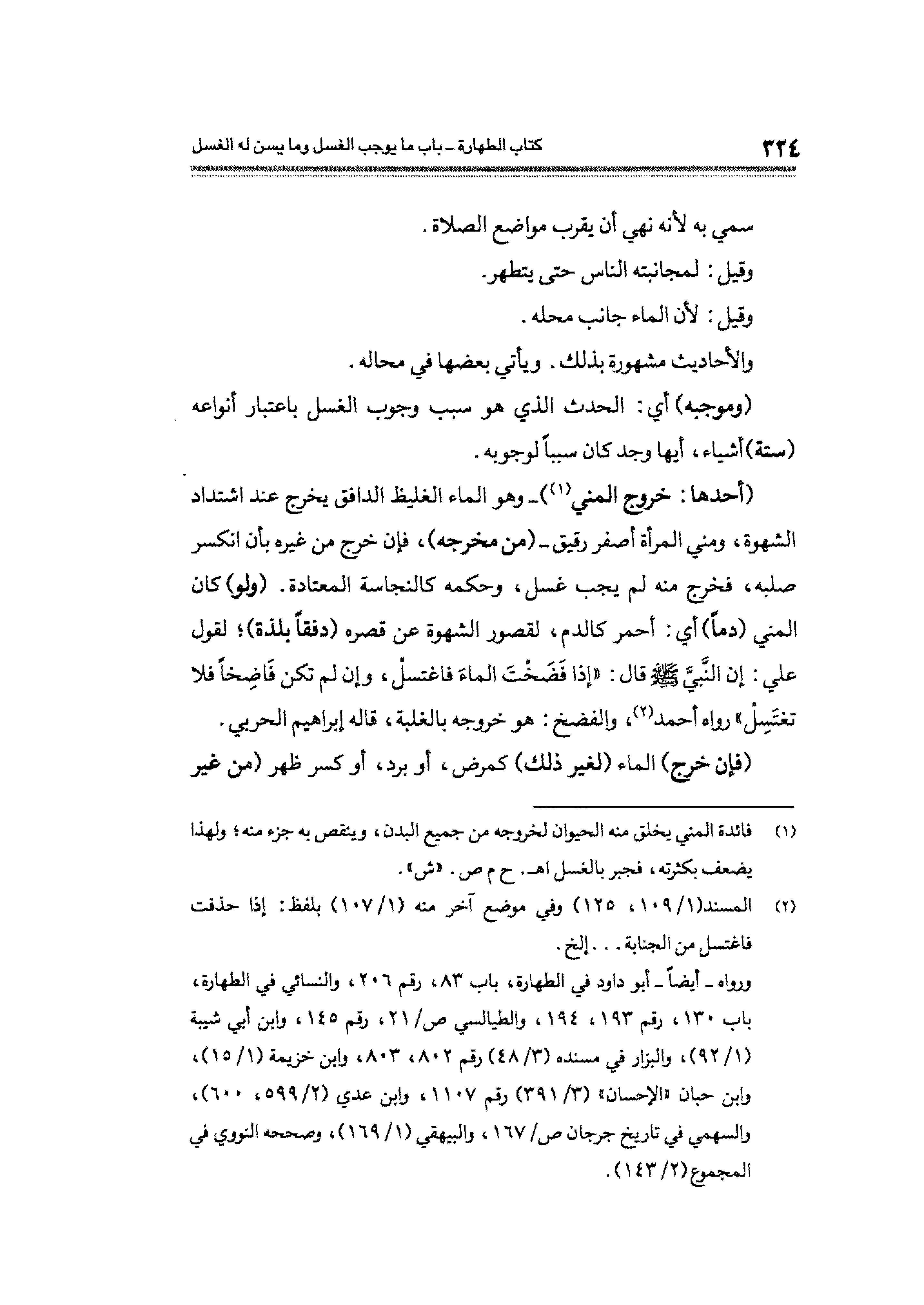 (¬١) فائدة المني يخلق منه الحيوان لخروجه من جميع البدن، وينقص به جزء منه؛ ولهذا يضعف بكثرته، فجبر بالغسل اهـ. ح م ص. "ش".