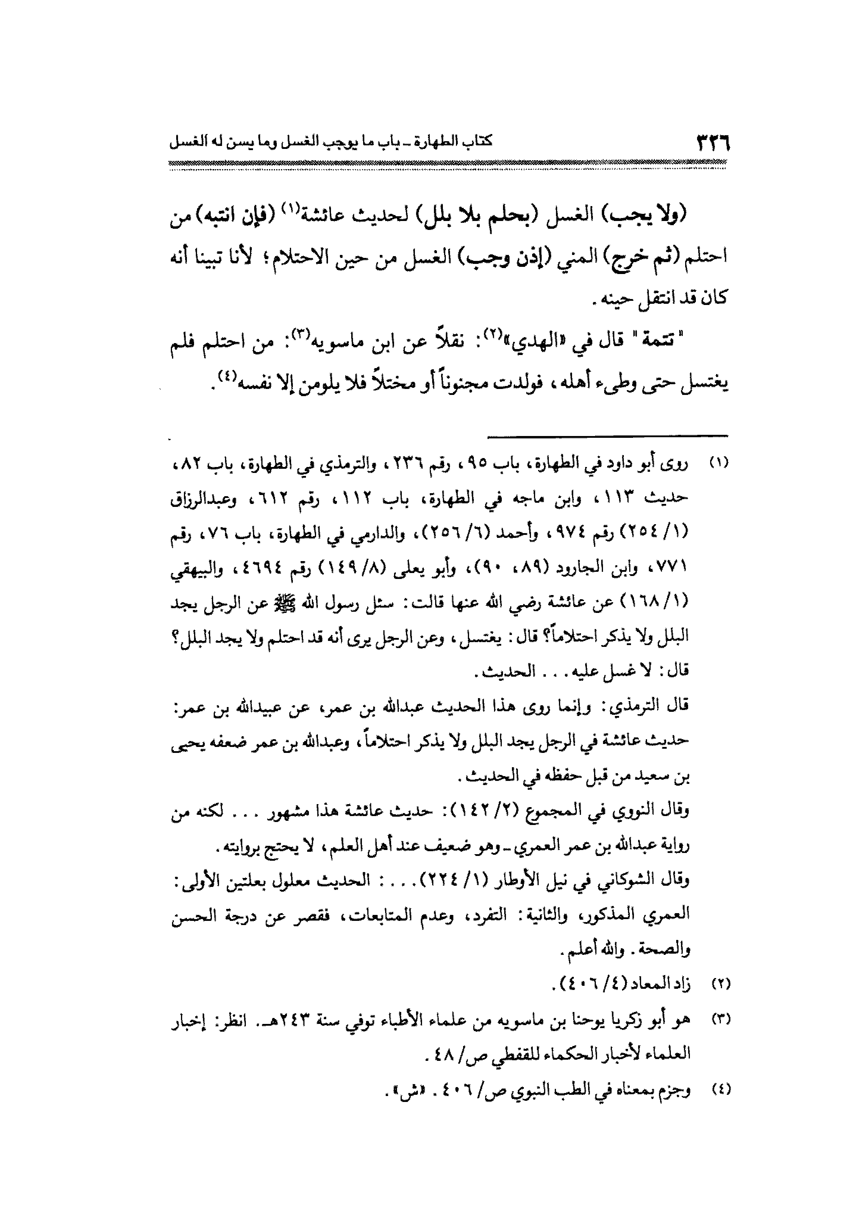 (¬١) روى أبو داود في الطهارة، باب ٩٥، رقم ٢٣٦، والترمذي في الطهارة، باب ٨٢، حديث ١١٣، وابن ماجه في الطهارة، باب ١١٢، رقم ٦١٢، وعبد الرزاق (١/ ٢٥٤) رقم ٩٧٤، وأحمد (٦/ ٢٥٦)، والدارمي في الطهارة، باب ٧٦، رقم ٧٧١ وابن الجارود (٨٩، ٩٠)، وأبو يعلى (٨/ ١٤٩) رقم ٤٦٩٤، والبيهقي (١/ ١٦٨) عن عائشة رضي الله عنها قالت: سئل رسول الله - صلى الله عليه وسلم - عن الرجل يجد البلل ولا يذكر احتلامًا؟ قال: يغتسل، وعن الرجل يرى أنه قد احتلم ولا يجد البلل؟ قال: لا غسل عليه ... الحديث.