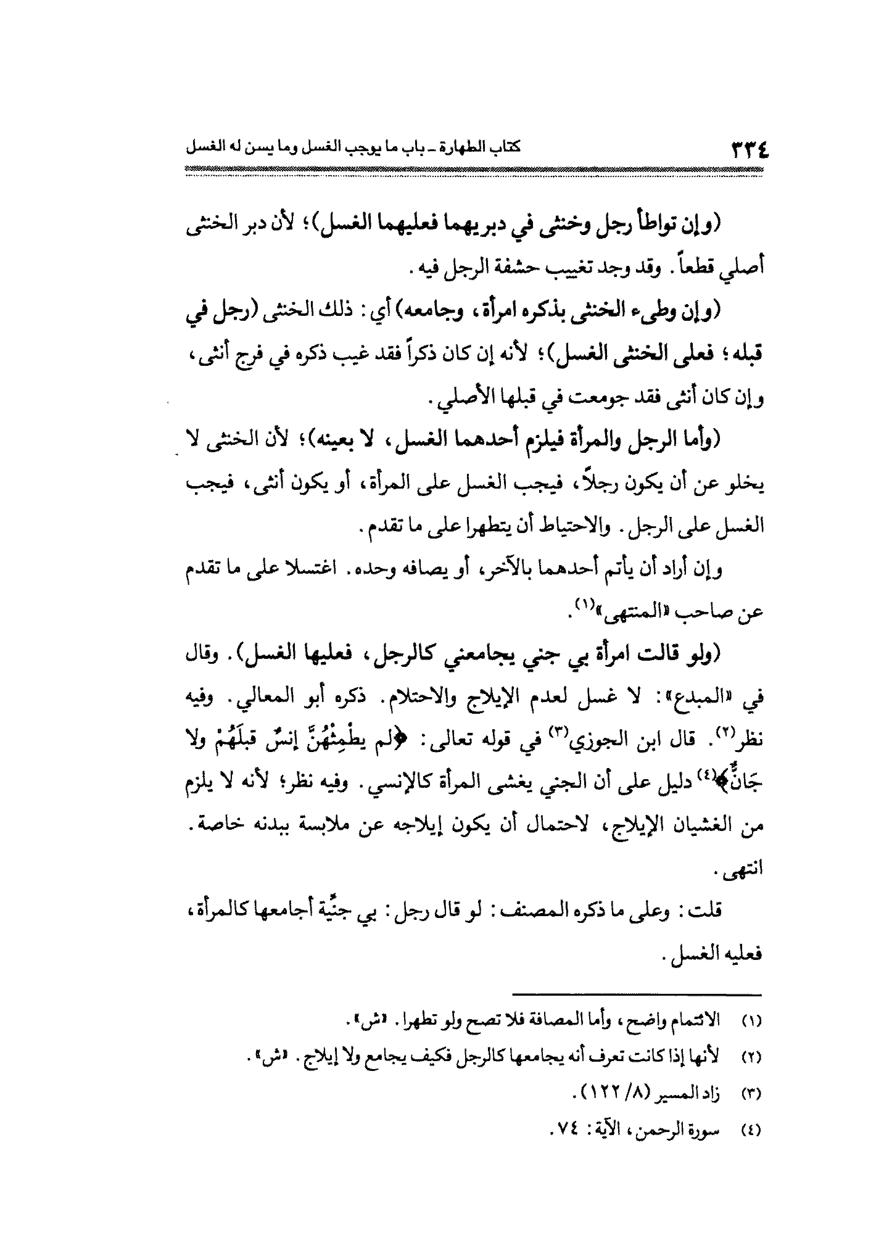 (ولو قالت امرأة بي جني يجامعني كالرجل، فعليها الغسل). وقال في "المبدع": لا غسل لعدم الإيلاج والاحتلام. ذكره أبو المعالي. وفيه نظر (¬٢). قال ابن الجوزي (¬٣) في قوله تعالى: {لَمْ يَطْمِثْهُنَّ إِنْسٌ قَبْلَهُمْ وَلَا جَانٌّ} (¬٤) دليل على أن الجني يغشى المرأة كالإنسي. وفيه نظر؛ لأنه لا يلزم من الغشيان الإيلاج، لاحتمال أن يكون إيلاجه عن ملابسة ببدنه خاصة. انتهى.