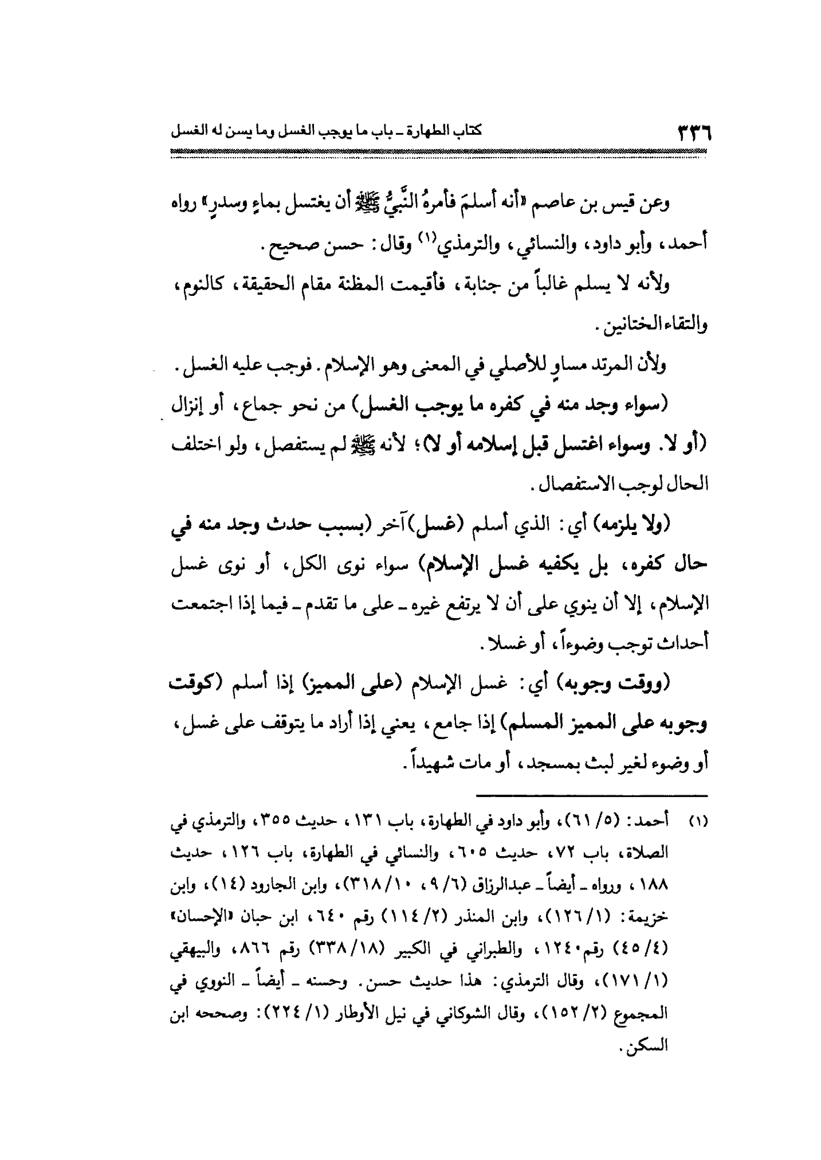 وعن قيس بن عاصم "أنه أسلمَ فأمرهُ النبي - صلى الله عليه وسلم - أن يغتسل بماءٍ وسدرٍ" رواه أحمد، وأبو داود، والنسائي، والترمذي (¬١) وقال: حسن صحيح.