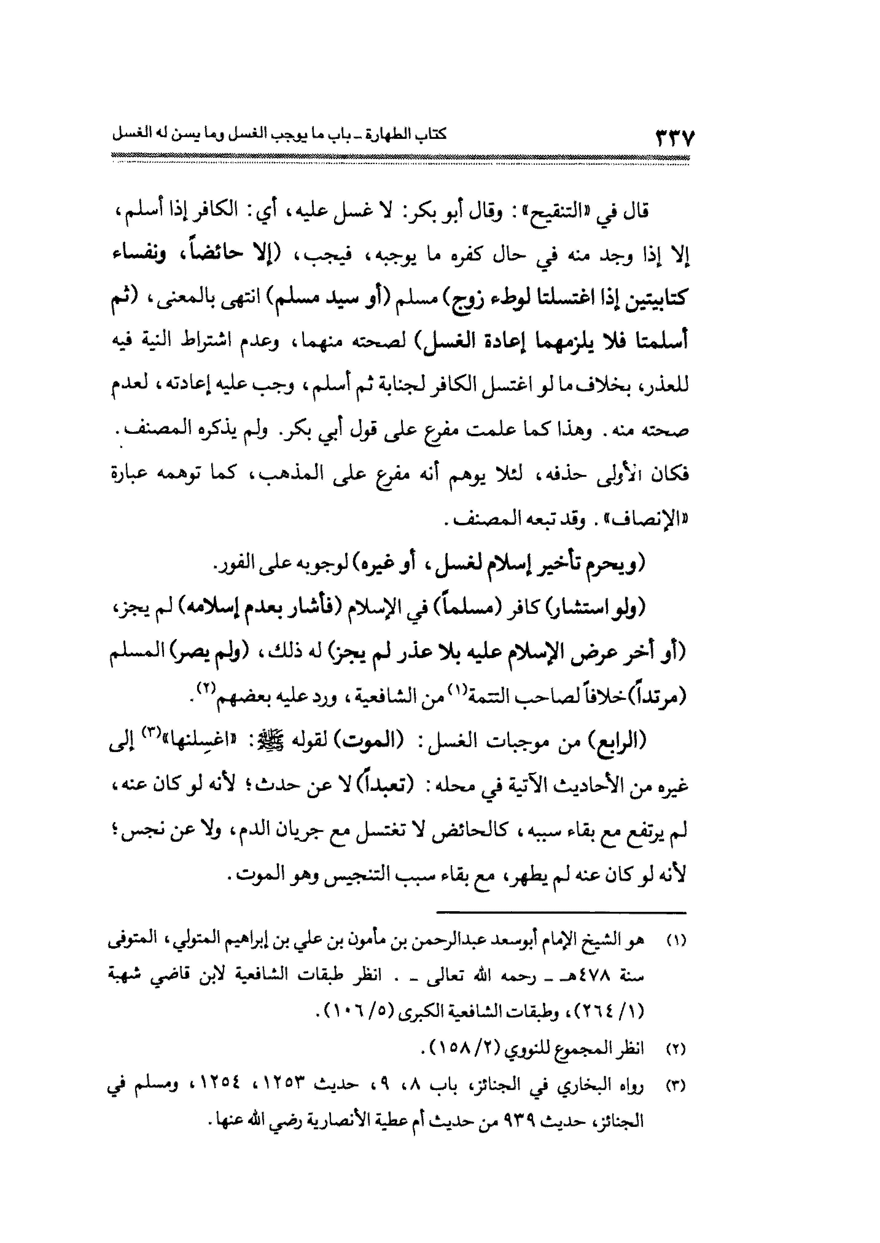 قال في "التنقيح": وقال أبو بكر: لا غسل عليه أي: الكافر إذا أسلم، إلا إذا وجد منه في حال كفره ما يوجبه، فيجب، (إلا حائضاً، ونفساء كتابيتين إذا اغتسلتا لوطء زوج) مسلم (أو سيد مسلم) انتهى بالمعنى، (ثم أسلمتا فلا يلزمهما إعادة الغسل) لصحته منهما، وعدم اشتراط النية فيه للعذر، بخلاف ما لو اغتسل الكافر لجنابة ثم أسلم، وجب عليه إعادته، لعدم صحته منه. وهذا كما علمت مفرع على قول أبي بكر. ولم يذكره المصنف. فكان الأولى حذفه، لئلا يوهم أنه مفرع على المذهب، كما توهمه عبارة "الإنصاف". وقد تبعه المصنف.
