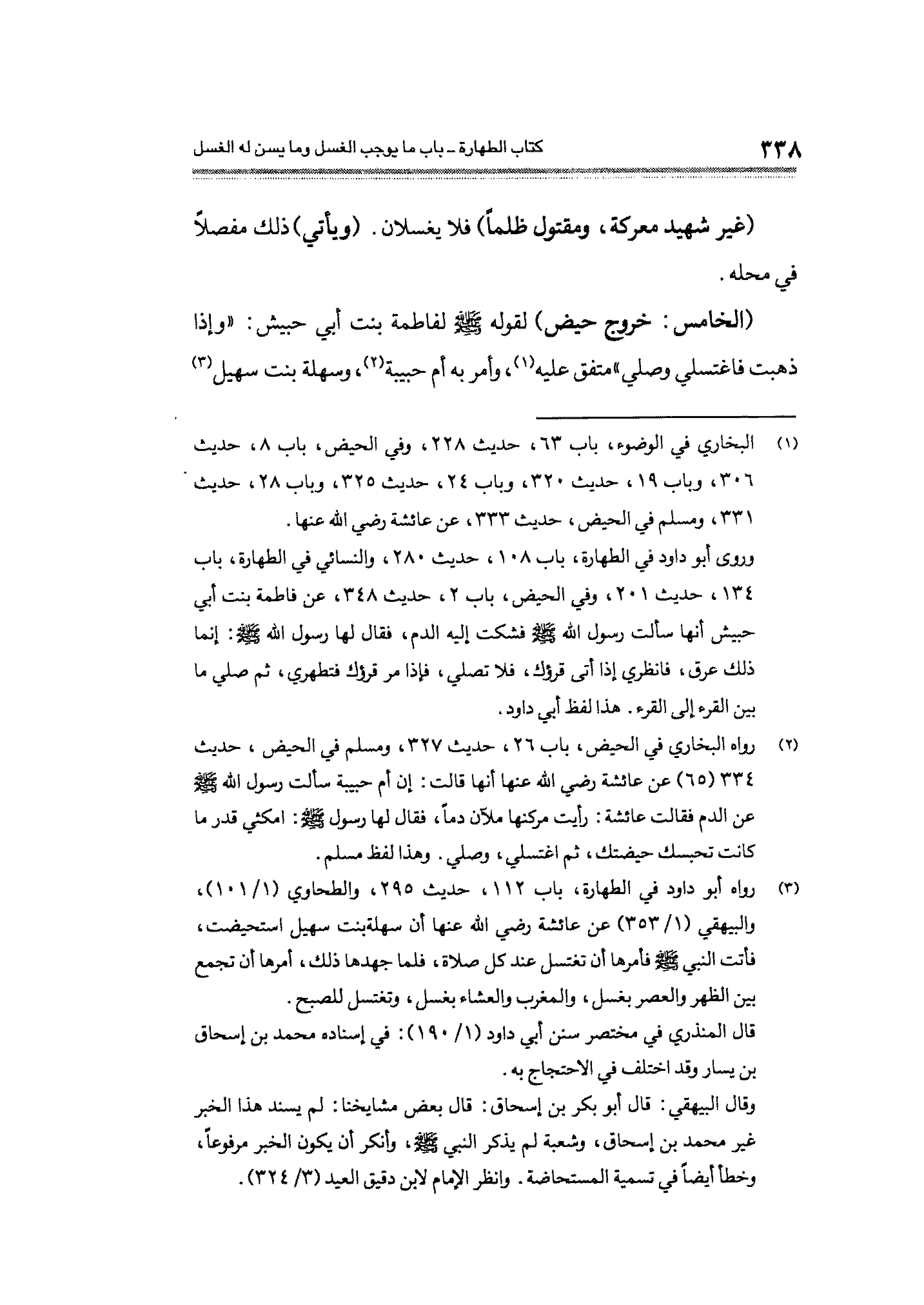 (غير شهيد معركة، ومقتول ظلماً) فلا يغسلان. (ويأتي) ذلك مفصلاً في محله. (الخامس: خروج حيض) لقوله - صلى الله عليه وسلم - لفاطمة بنت أبي حبيش: "وإذا ذهبت فاغتسلي وصلي" متفق عليه (¬١)، وأمر به أم حبيبة (¬٢)، وسهلة بنت سهيل (¬٣)