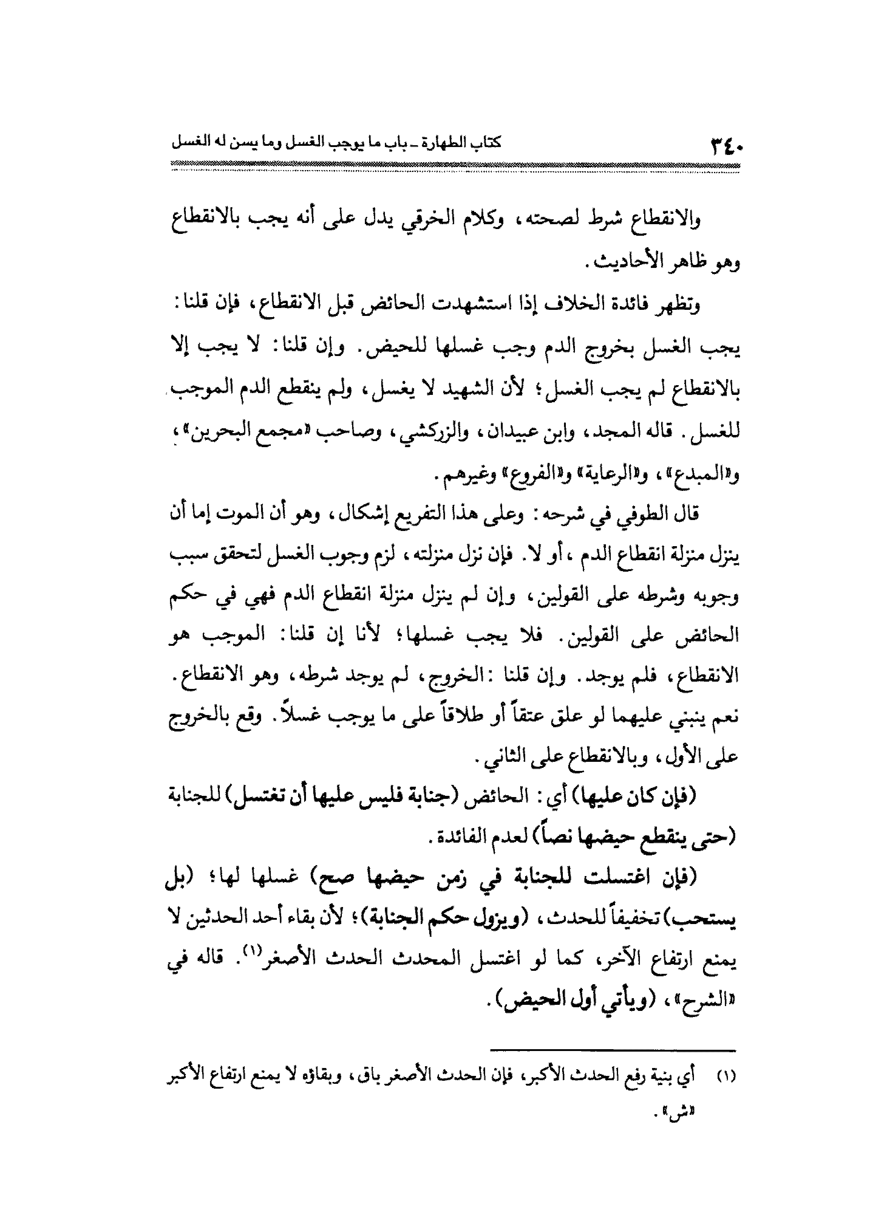 قال الطوفي في شرحه: وعلى هذا التفريع إشكال، وهو أن الموت إما أن ينزل منزلة انقطاع الدم، أو لا. فإن نزل منزلته، لزم وجوب الغسل لتحقق سبب وجوبه وشرطه على القولين، وإن لم ينزل منزلة انقطاع الدم فهي في حكم الحائض على القولين. فلا يجب غسلها؛ لأنا إن قلنا: الموجب هو الانقطاع، فلم يوجد. وإن قلنا: الخروج، لم يوجد شرطه، وهو الانقطاع. نعم ينبني عليهما لو علق عتقاً أو طلاقاً على ما يوجب غسلاً. وقع بالخروج على الأول، وبالانقطاع على الثاني.