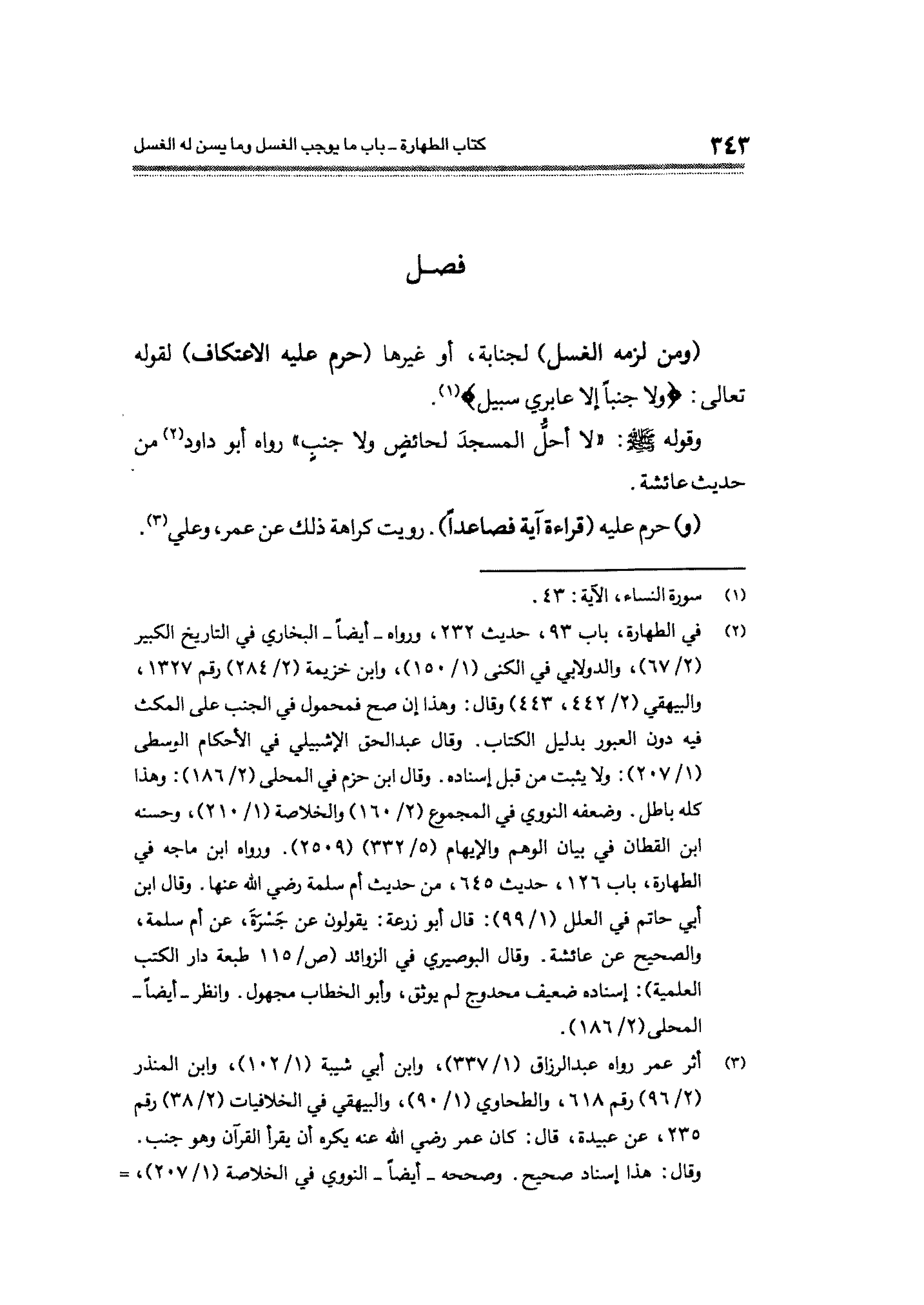 (¬٣) أثر عمر رواه عبد الرزاق (١/ ٣٣٧)، وابن أبى شيبة (١/ ١٠٢)، وابن المنذر (٢/ ٩٦) رقم ٦١٨، والطحاوى (١/ ٩٠)، والبيهقي في الخلافيات (٢/ ٣٨) رقم ٢٣٥، عن عبيدة، قال: كان عمر رضي الله عنه يكره أن يقرأ القرآن وهو جنب. وقال: هذا إسناد صحيح. وصححه -أيضاً- النووي في الخلاصة (١/ ٢٠٧)، =
