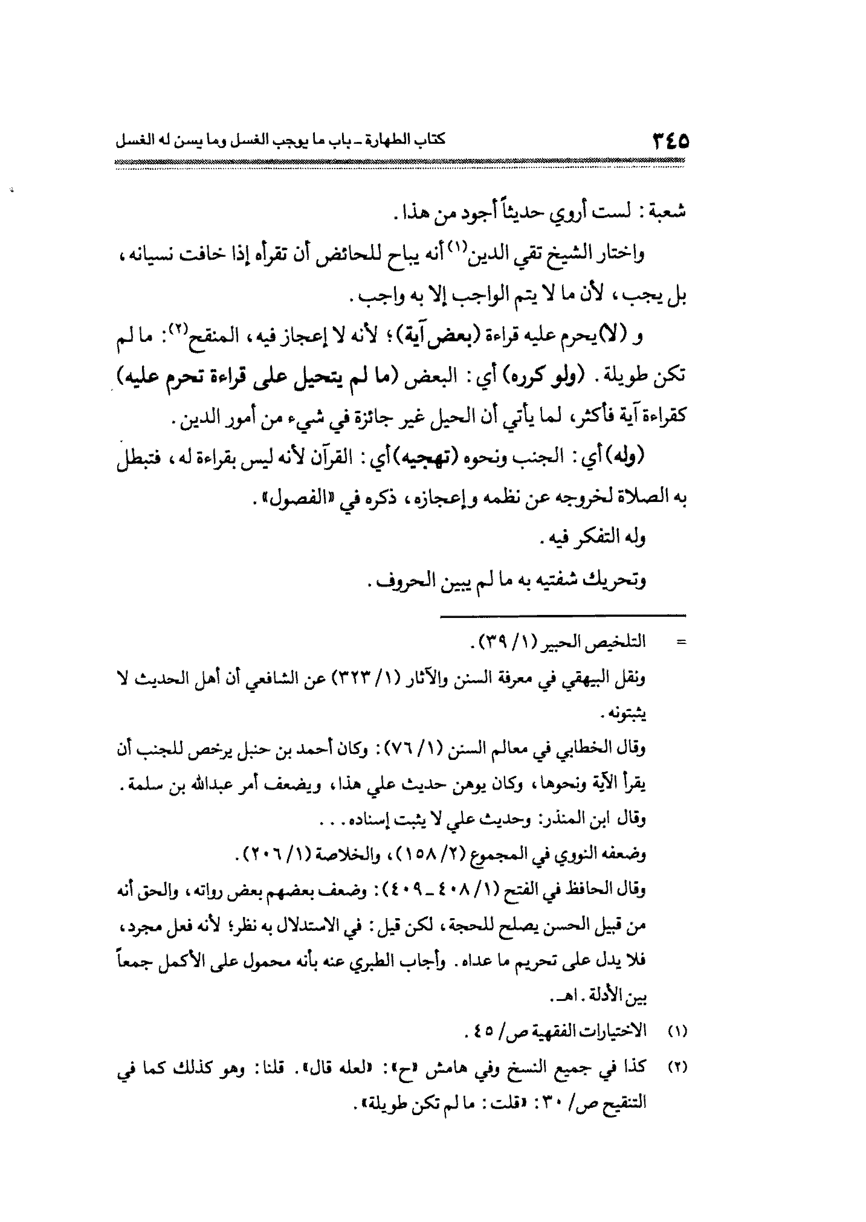 وقال الخطابي في معالم السنن (١/ ٧٦): وكان أحمد بن حنبل يرخص للجنب أن يقرأ الآية ونحوها، وكان يوهن حديث علي هذا، ويضعف أمر عبد الله بن سلمة. وقال ابن المنذر: وحديث علي لا يثبت إسناده ...